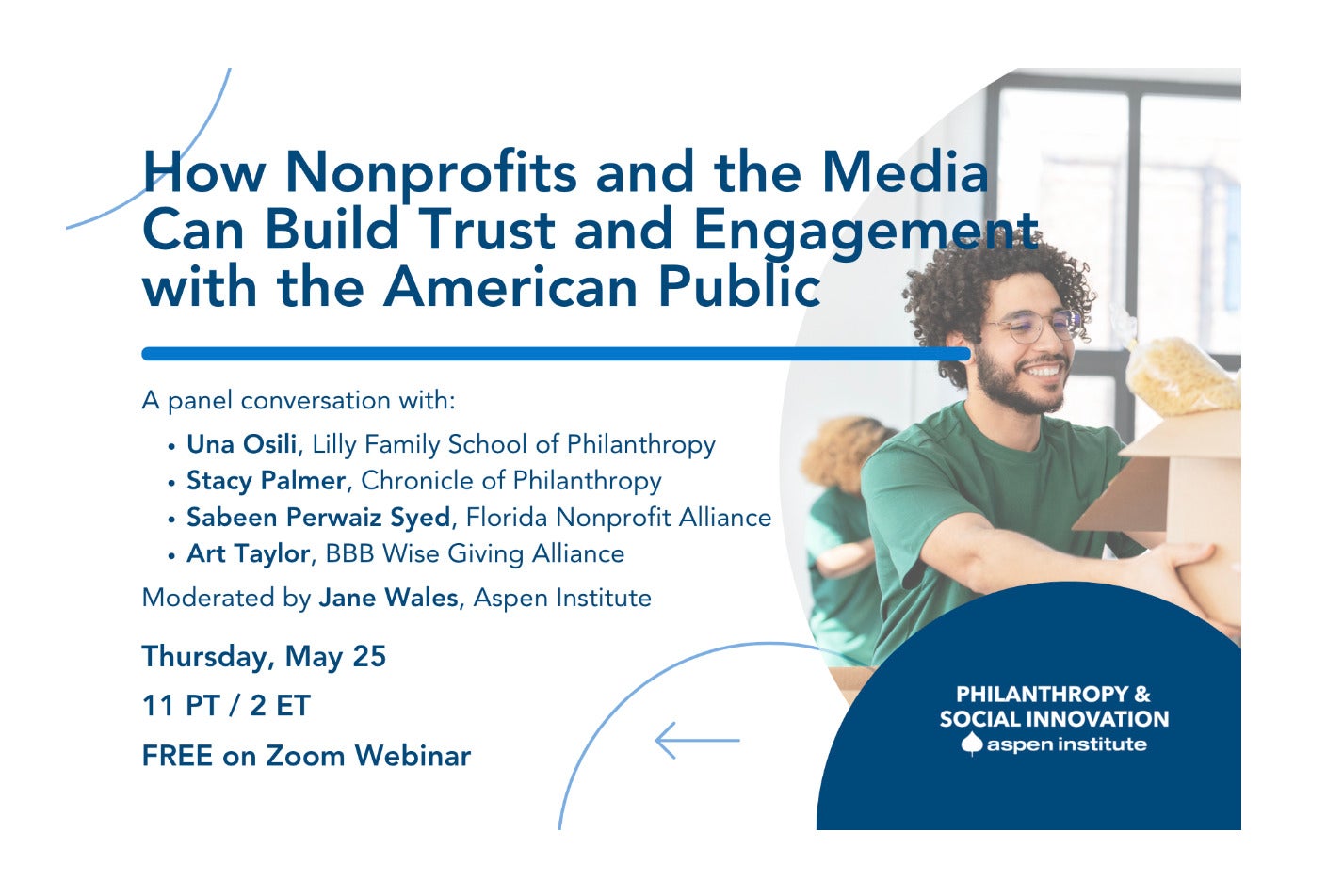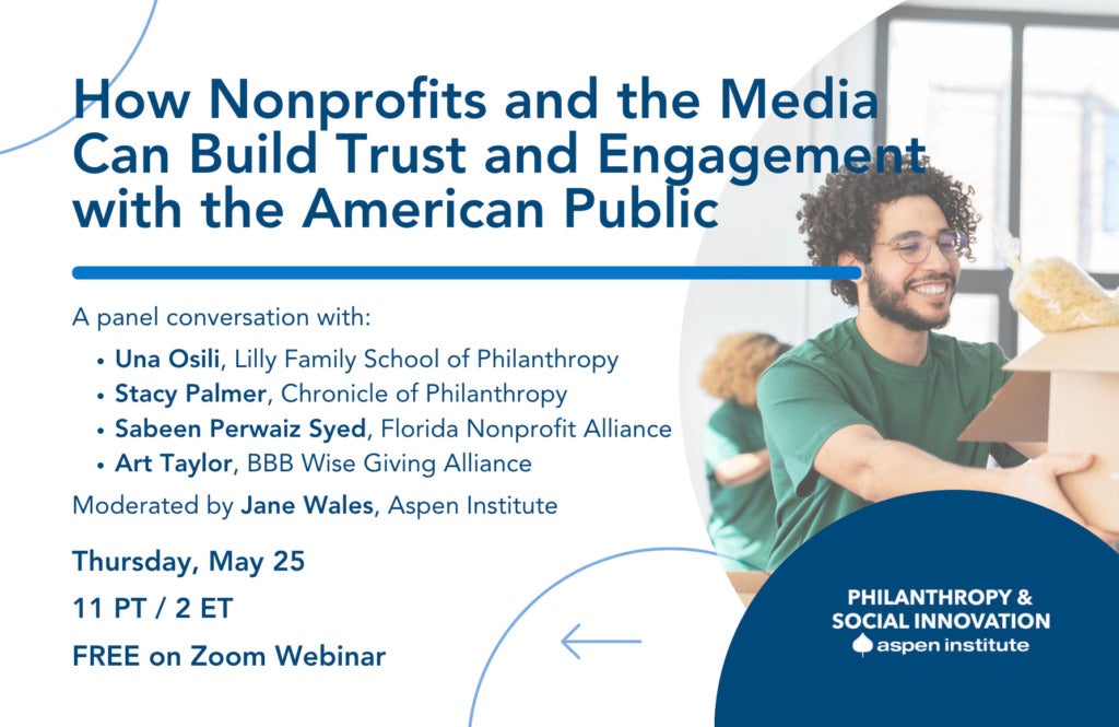 Nonprofits play a major role in everyday American life. They create green spaces for kids to play, ensure people can receive medical care, provide religious services, and fill communities with art and music, among other contributions.Yet there is a disconnect between what nonprofits provide and how Americans perceive those benefits in their lives.A recent study by the Indiana University Lilly Family School of Philanthropy found that only 5.4 percent of Americans said they or anyone in their immediate family received services from a nonprofit in the past year. How can nonprofits better share their impact in a way that helps the public connect to the story—and see themselves as an essential part of it?Join the Aspen Institute’s Program on Philanthropy and Social Innovation together with the Lilly Family School of Philanthropy for a virtual discussion with distinguished guests from across the social sector to explore: