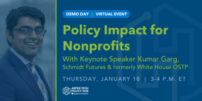 The Aspen Tech Policy Hub invites you to join our virtual Nonprofit and Public Interest Demonstration Day on January 18, 2024 from 3:00-4:00pm ET/ 12:00-1:00pm PT. The webinar will feature policy projects and case studies on technology, environmental, and social justice topics from our inaugural cohort of nonprofit fellows. Kumar Garg, the powerhouse behind partnerships at Schmidt Futures and former leader in the Obama administration’s White House Office of Science and Technology Policy (OSTP), will provide keynote remarks.