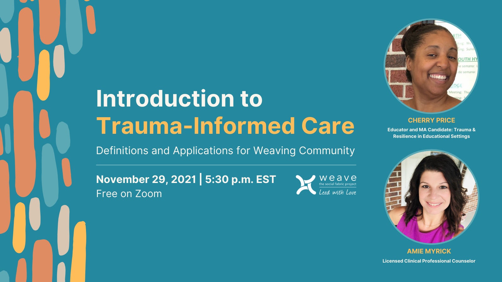 Many people have heard the term “trauma-informed care”, but not everyone knows what it means or how it fits in with their personal or professional lives. Join Cherry Price (Educator and MA Candidate: Trauma & Resilience in Educational Settings) and Amie Myrick (Licensed Clinical Professional Counselor) to learn the basics of trauma-informed care, including practical ways to begin applying this information to your interactions with people you may encounter in your community. Participants will also discuss the intersection of trauma informed care and cultural sensitivity.