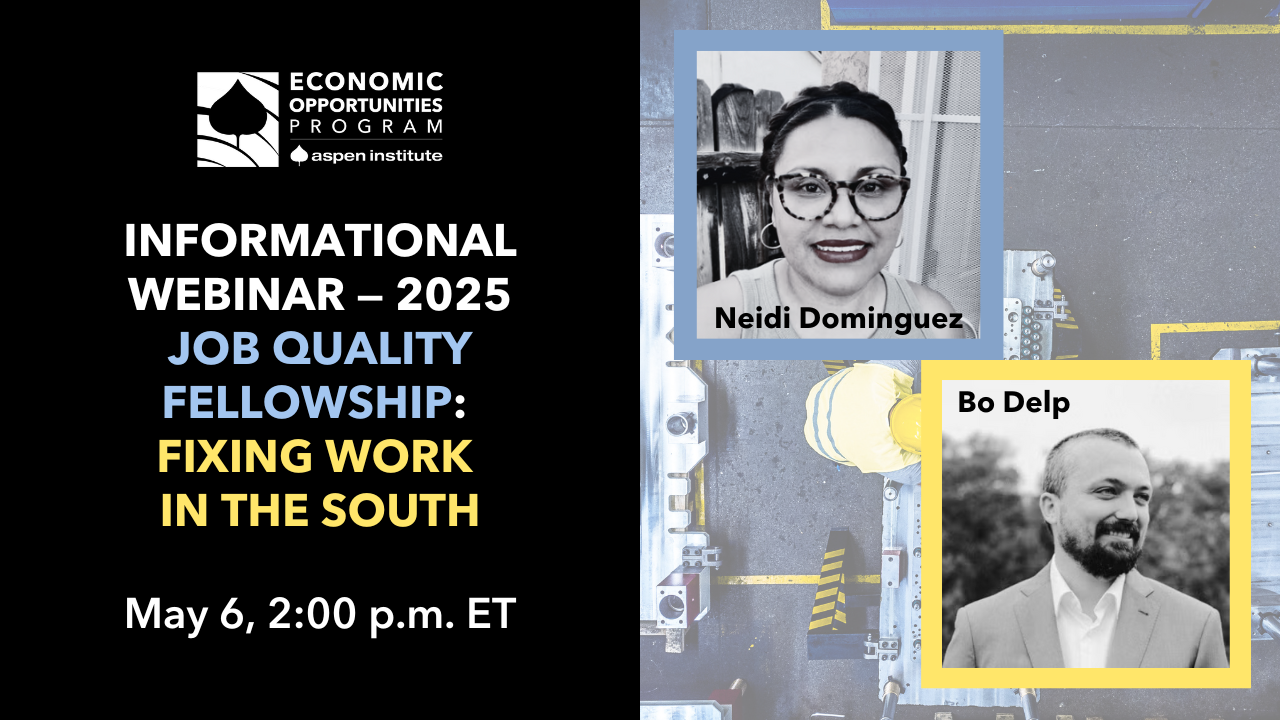 On Tuesday, May 6, from 2:00 to 3:00 p.m. EDT, the Aspen Institute Economic Opportunities Program will host an informational webinar about the Job Quality Fellowship: Fixing Work in the South. In addition to providing an overview of the nomination and application process, we’re pleased to welcome two Job Quality Fellows to this conversation — Neidi Dominguez Zamorano, founding executive director of Organized Power in Numbers, and Bo Delp, executive director of the Texas Climate Jobs Project — who will share their experience as members of the Fellowship. We will also leave plenty of time for your questions at the end.