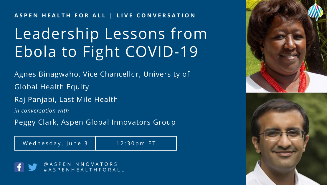 As countries around the world fight to contain COVID-19, learnings from the 2014-2016 Ebola crisis provide key insights to tackle this new pandemic. On Wednesday, June 3 at 12:30pm ET, the Aspen Global Innovators Group hosted a live conversation with Dr. Agnes Binagwaho, former Minister of Health of Rwanda and Vice Chancellor of the University of Global Health Equity and Dr. Raj Panjabi, Co-Founder and CEO of Last Mile Health. The two shared how African leaders are using lessons from Ebola to combat COVID-19.