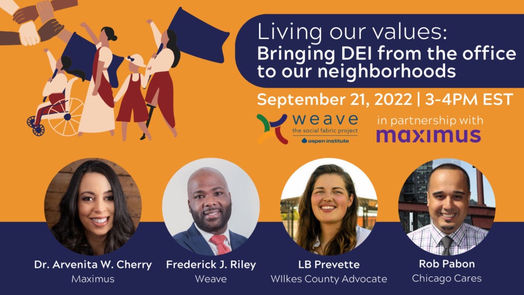 In any social setting, we carry our histories and multiple social identities. Those are often subconscious. Diversity, Equity, and Inclusion (DEI) initiatives at work has helped us become more aware of our own identities and value those of coworkers. These tools can also help us support our communities. In this one-hour virtual gathering, we’ll discuss what it looks like to bring DEI awareness into our local work, so everyone feels welcome and that they belong. We’ll hear from those using DEI to connect their neighborhoods about how to do this work. Weave’s Executive Director Frederick J. Riley will host the hour with Dr. Arvenita Cherry of Maximus, a leading provider of health and human services.