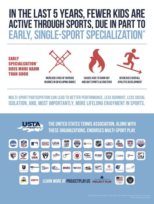The roundtable comes on the heels of an announcement by 28 national governing bodies of sport, five professional leagues, and other leaders from sport and health in support of multi-sport play. Led by the US Tennis Association, the announcement took the form of an ad in the Sports Business Journal in mid-August. The statement represents the first collective effort by the sports industry to mobilize around a key strategy in the Project Play report.
