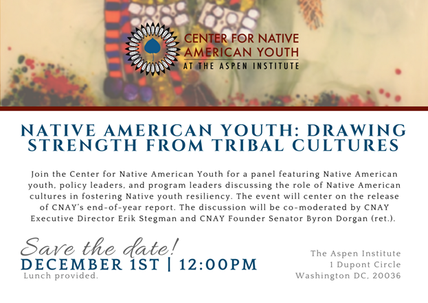 Join the Center for Native American Youth for a panel featuring Native American youth, policy leaders, and program leaders discussing the role of Native American cultures in fostering Native youth resiliency. The event will center on the release of CNAY’s end-of-year report and highlight data gathered from the inaugural Generation Indigenous Native youth survey. The discussion will be co-moderated by CNAY Executive Director Erik Stegman and CNAY Founder Senator Byron Dorgan (ret.). Lunch buffet provided.