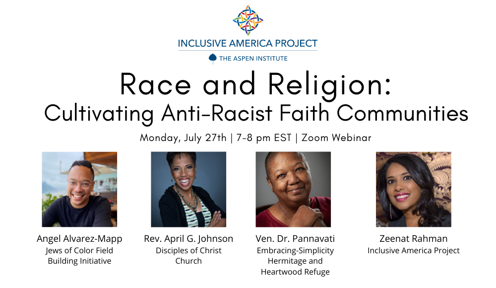 As part of a larger, invitation-only program on leadership in faith communities, the Inclusive America Project will host a moderated webinar open to the public, featuring leaders who have been actively engaged in anti-racism advocacy within their respective faith communities.