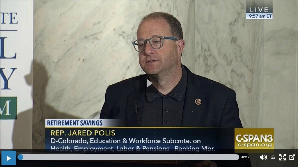 “Retirement security impacts every American family, and Congress must be committed to finding innovative solutions to solve our growing retirement gap,” said Rep. Jared Polis (D-CO), who offered opening remarks at the event. “Helping families plan for retirement is not a partisan issue; it’s an issue that needs problem solvers. That’s why I’m pleased to be participating as a guest of the Aspen Institute, and to be joining other public officials and industry experts as we look for solutions that work for the next generation of retirees.”