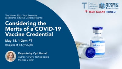 On May 18th, the leaders of the Aspen Tech Policy Hub and Tech Talent Project’s Winter 2021 Tech Executive Leadership Initiative Cohort showcased their projects focused on ‘Considering the Merits of a COVID-19 Vaccine Credential.’ Following the presentations, Cyd Harrell, author of ‘A Civic Technologist’s Practice Guide,’ gave a keynote address.