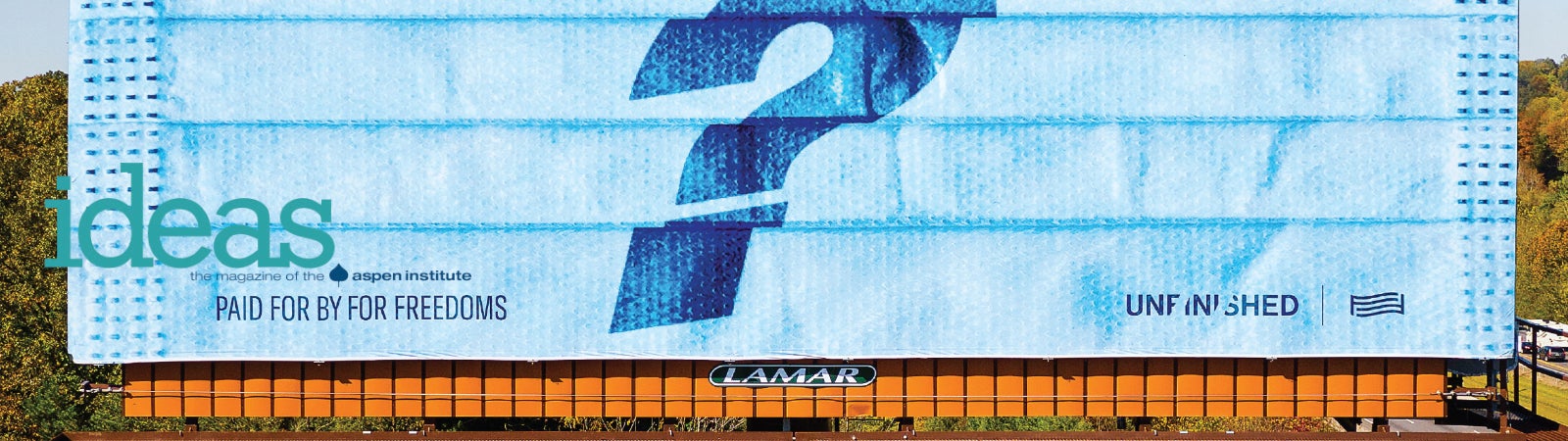 Unfinished isn’t putting itself forward as an organization that has all the answers. “We’re in a time of great challenge and concern and trepidation, but also opportunity for growth and positive change,” McCourt says. “We need to be thoughtful, patient, humble, and open-minded. That leads to one conclusion: we need to listen and learn.” Recently, Unfinished joined with the artist-led organization For Freedoms on a campaign to put creative voices at the center of national and international conversations, generating big questions and displaying them in public places on billboards in all 50 states. “Our billboard campaign is the great equalizer for accessing art,” says Claudia Peña, the executive director of For Freedoms. “There’s no fee to pay, no intimidating door to walk through, no exclusive club focused on inviting VIPs. You just need to be on a road to somewhere.”