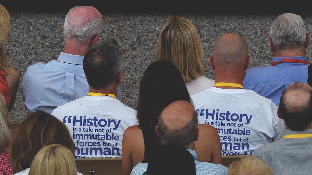 I include the picture to show off the T-shirts that two friends and fans of IDEAS were wearing: this year’s version of the shirts we distribute every summer to the people who make the campus hum. Because this would be Walter Isaacson’s last summer presiding, and because this was a summer of trying to understand shifting historical forces, we chose a phrase from Walter’s Benjamin Franklin: “History is a tale not of immutable forces but of human endeavors.”
