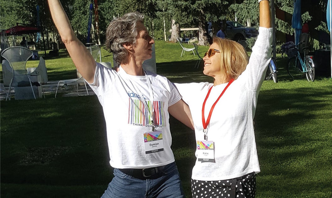 Forward motion is what animates every summer at Aspen. No one demonstrated this more elegantly than my two favorite models of our annual IDEAS Magazine t-shirt, shown above: Damian Woetzel, about to dance his way to the Julliard School as Erika Mallin came onstage to direct the Insititute’s Arts Program; and board member Katie Couric, who in public dances her way through life but spends much of the Aspen Ideas Festival sprinting to a secluded room to intensely prepare for the substantive, fearless conversations that make the summer’s ideas dance in our minds for months to come.