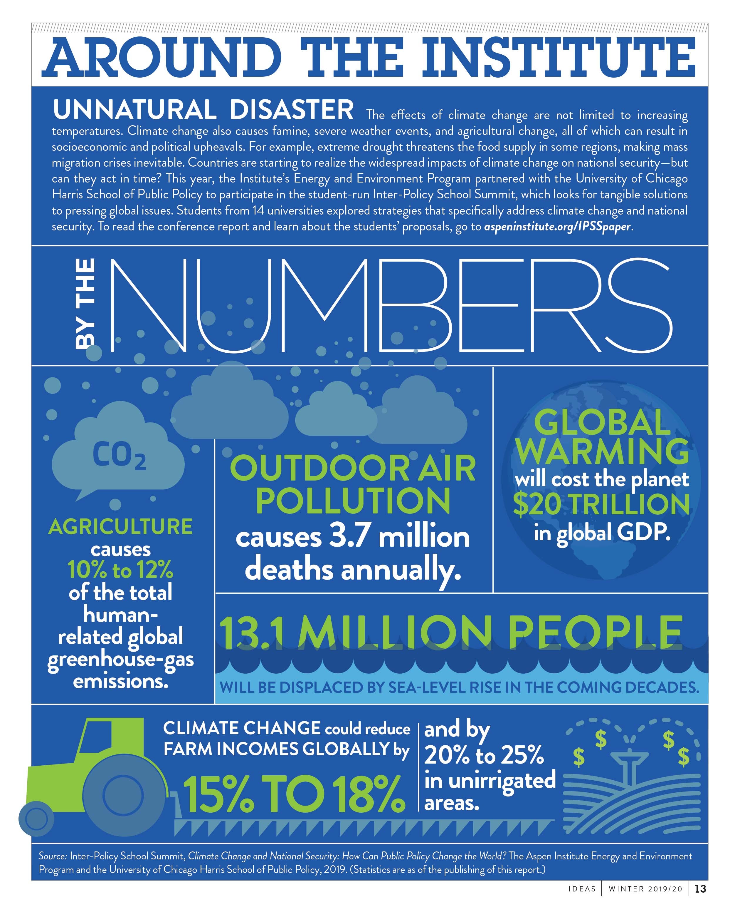 The effects of climate change are not limited to increasing temperatures. Climate change also causes famine, severe weather events, and agricultural change, all of which can result in socioeconomic and political upheavals. For example, extreme drought threatens the food supply in some regions, making mass migration crises inevitable. Countries are starting to realize the widespread impacts of climate change on national security—but can they act in time? This year, the Institute’s Energy and Environment Program partnered with the University of Chicago Harris School of Public Policy to participate in the student-run Inter-Policy School Summit, which looks for tangible solutions to pressing global issues. Students from 14 universities explored strategies that specifically address climate change and national security. To read the conference report and learn about the students’ proposals, go to aspeninstitute.org/IPSSpaper.