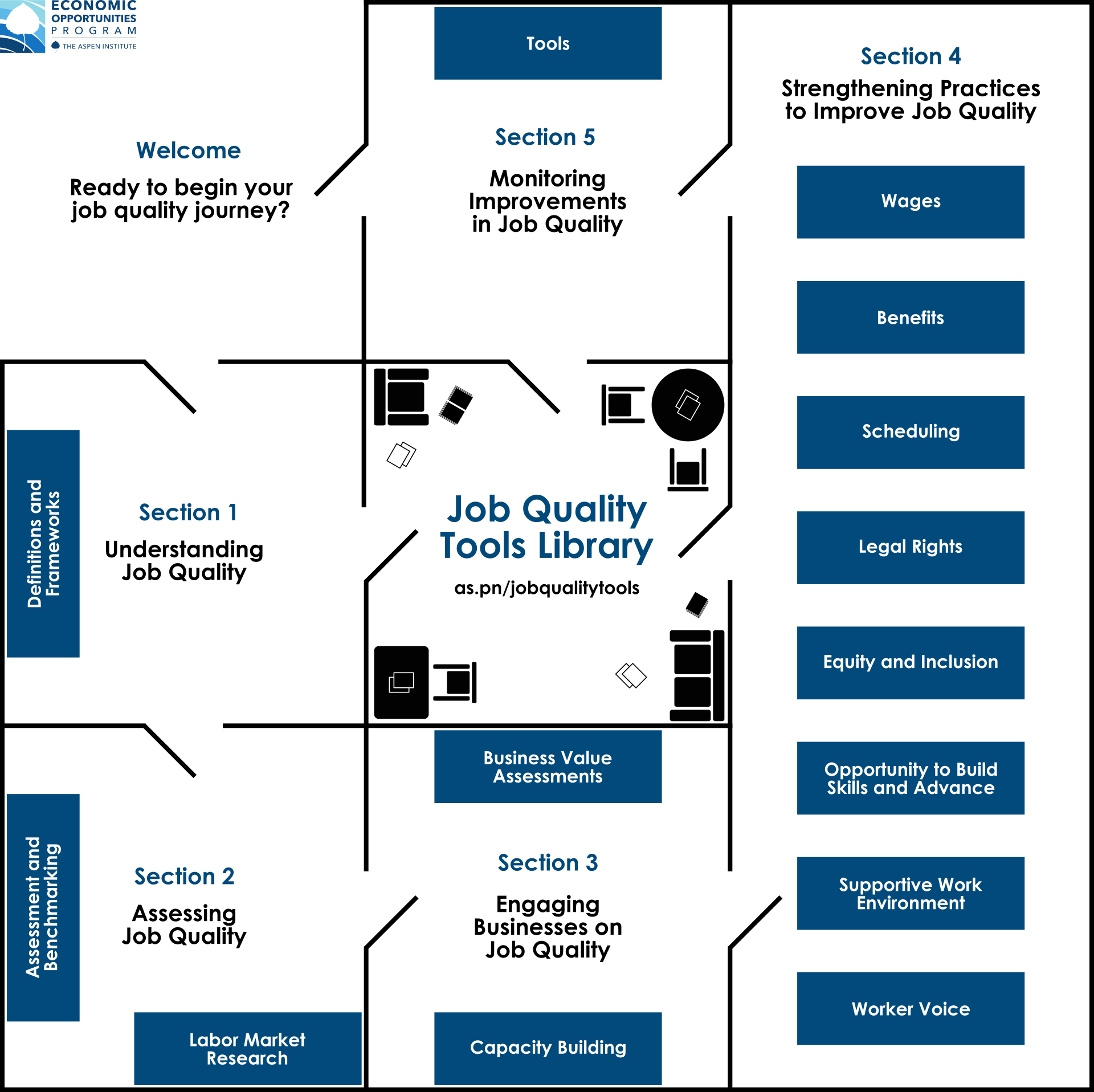The Aspen Institute Economic Opportunities Program developed this Job Quality Tools Library to support leaders working in a variety of fields related to economic opportunity to engage in practical action to improve jobs. The library offers tools, resources, and guidance to help leaders adopt practices to strengthen job quality in their own organizations, in the businesses they partner with, and across labor markets. Browse the library through the stacks below, or visit our Index to view tools by field of practice.