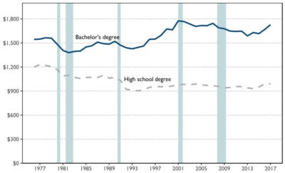 In addition to growing gaps in employment rates, there are large earnings gaps between those with and without a college degree. In 2017, workers with a college degree earned nearly two thirds more than workers without a college degree. As Figure 1 demonstrates, the earnings gap in weekly earnings between workers with a college degree and those with a high school degree increased substantially in the latter half of the 20th century, and that gap remains large. Increasing the number of Americans with a college degree would advance both individual economic security and the productivity and competitiveness of the American economy more broadly.