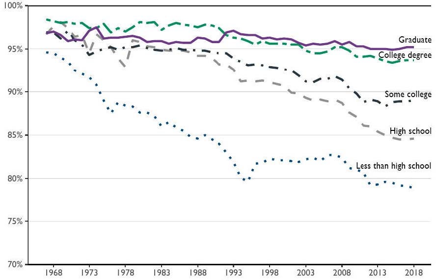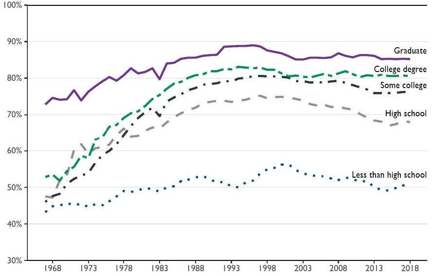 The modern economy greatly favors college-educated workers. Employment rates among those without a college degree have fallen substantially in recent decades. Prime-age men used to participate in the labor force in roughly equal measure across education groups. That is no longer the case. A 2016 Council of Economic Advisers report notes that in 1964, 98% of prime-age men with a college degree or more participated in the workforce, compared to 97% of men with a high school degree or less. In 2015, the participation rate for college-educated men had fallen only slightly to 94%, while the rate for men with a high school degree or less had dropped precipitously to 83%. Since the early 1990s, the labor force participation of prime-age women has also fallen by much more among those without a college degree. In 2016, the labor force participation rate among prime-age women with a bachelor’s degree or higher was 87%, as compared to 62% for those with a high school degree or less.