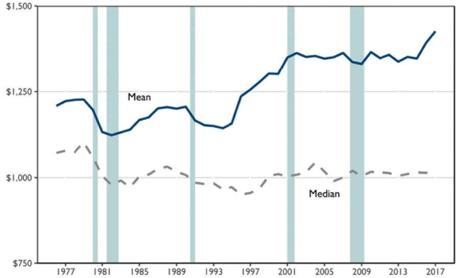 In the three decades following the end of World War II, the income of a typical American household grew by roughly 3% per year. Since the 1970s, low- and middle- income American households have experienced income gains of only one percent per year. Figure 3 compares mean and median weekly earnings since the late 1970s. Median earnings have been stagnant since the early 1980s, while mean weekly earnings have grown slightly more, reflecting that wage growth has been concentrated at the upper end of the income distribution.