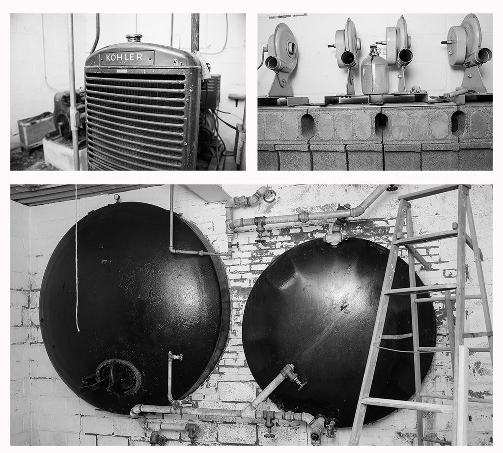 Rows of canned and dried goods took up one large storeroom, with Houghton’s directions for rotating and discarding outdated items written out in detail. Chemical toilets were designed to save precious water. Generators were housed in one “clean” area where they could be maintained and fueled, to be vented into another “dirty” one: radiation was inevitable in a space open to the outside air. Two water tanks held about 5,000 gallons between them—but were divided so that a leak in one would leave the second available for use. Air vents could be operated in two ways: by the generators and, if those failed, by hand crank, with sturdy hardware that still works, as Covert demonstrates for us. Bunk beds, gone since the shelter became a storage facility for Institute archives, furnished each room, with a special suite designated for the owners—the chintz fabric of an ancient settee and an upholstered screen hint at the ambience. There was even a stack of body bags in a remote corner.