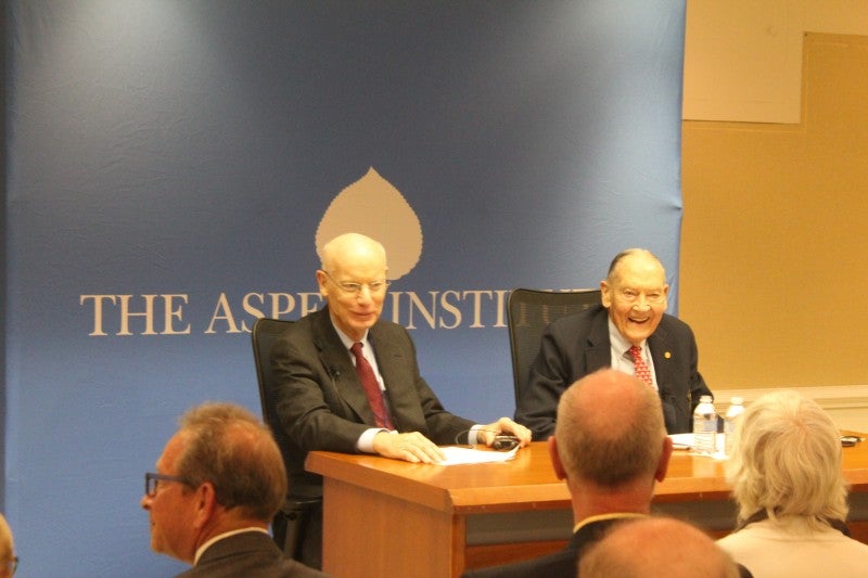 Aspen Wye Fellow and Moderator Alan Griffith, left, in conversation with Jack Bogle