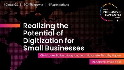 Digitization can help small businesses access information, markets, and financial services, but they face greater barriers than large firms in using technology. This is especially true for small businesses owned by women, racial and ethnic minorities, immigrants, and refugees. How can we help small businesses—which are crucial to employment around the globe—take advantage of this shift? On October 21, Business Ownership Initiative Director Joyce Klein moderated a discussion on Realizing the Potential of Digitization for Small Businesses, part of the 2021 Global Inclusive Growth Summit. A recording of this discussion is now available, and you can view it here. The conversation features Chris Locke (Caribou Digital), Barbara Magnoni (EA Consultants), Juan Navarrete (Fundación Capital), and BOI Senior Fellow Tim Ogden (Financial Access Initiative). Learn more.