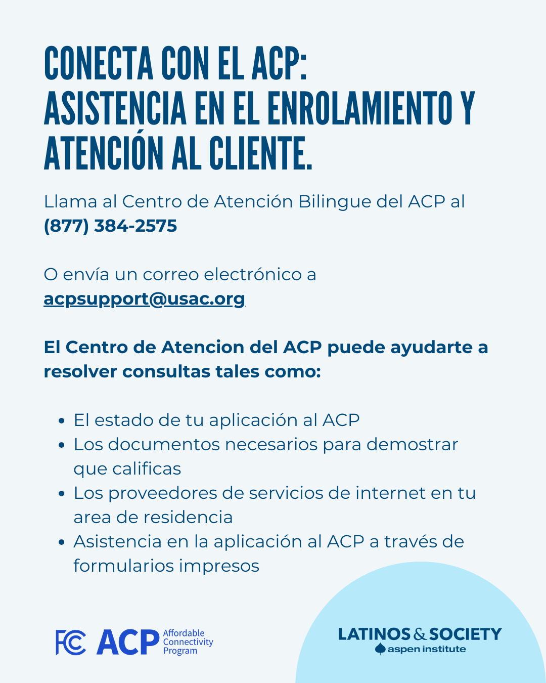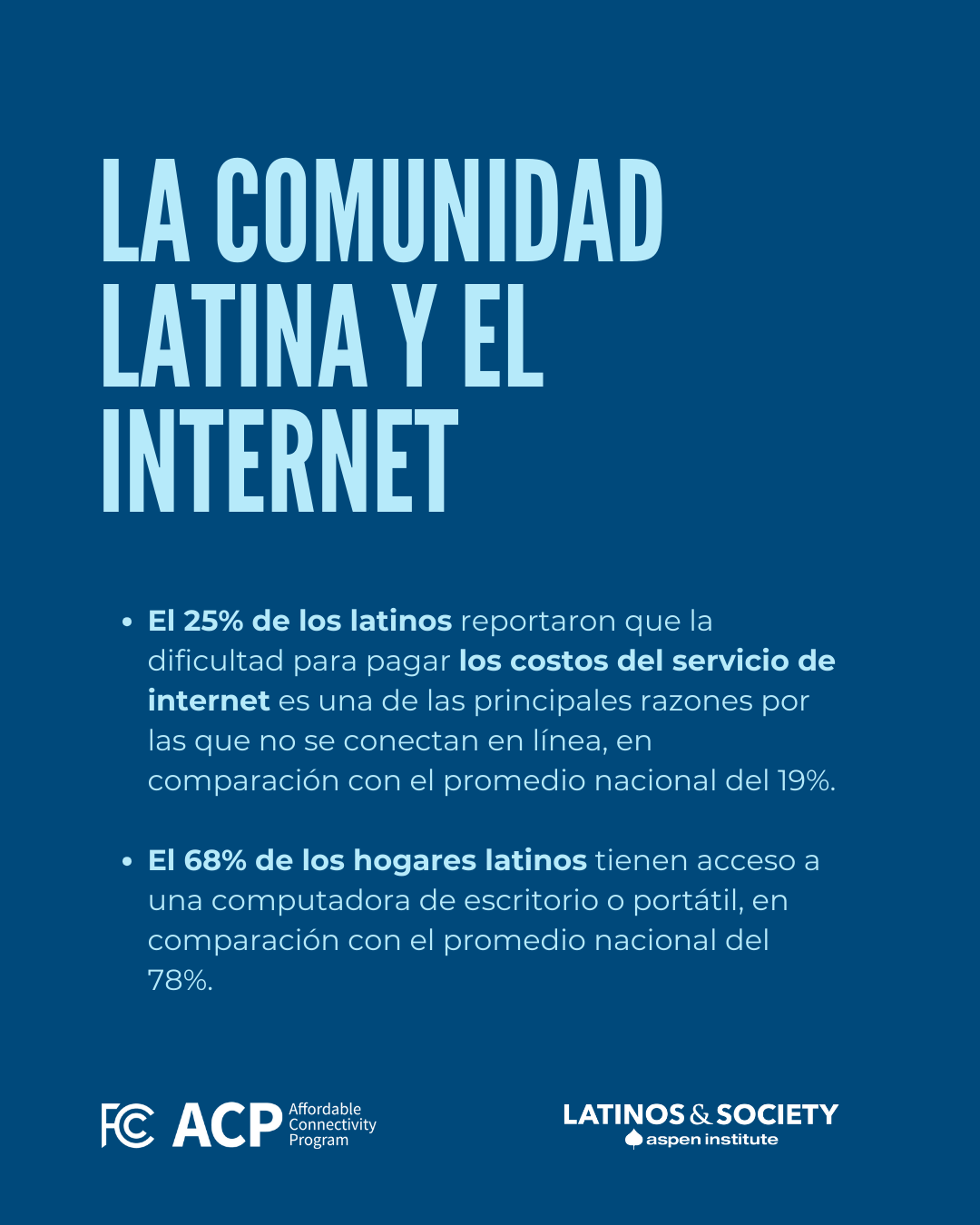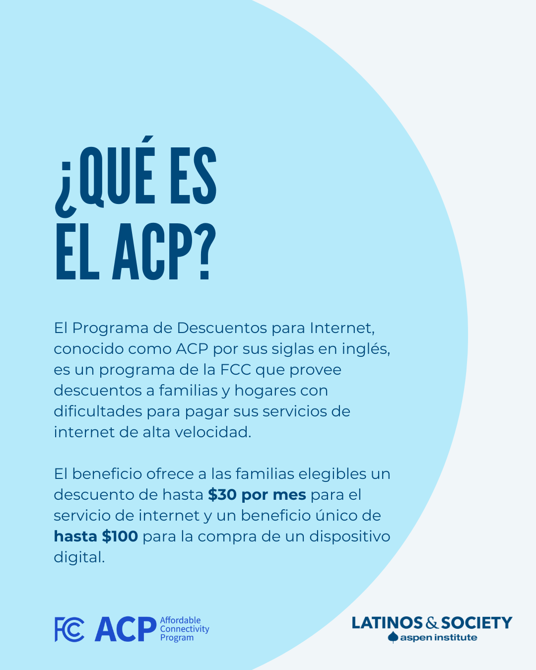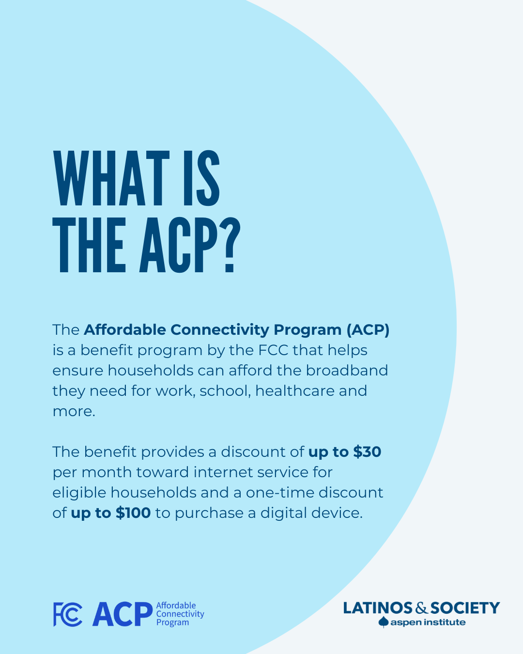 Aspen Latinos was awarded a grant to support the FCC’s Affordable Connectivity Program (ACP) outreach efforts over the next two years. This federally funded benefit provides a discount of up to $30 per month toward internet service for eligible households and up to $75 per month for households on qualifying Tribal lands. Eligible households can also receive a one-time discount of up to $100 to purchase a device.Aspen Latinos is developing and deploying a public awareness campaign in both English and Spanish through traditional media channels and social media. Aspen Latinos will also collaborate with trusted community organizations to spread the benefit and promote enrollment of eligible households. Below are preliminary ACP outreach collateral items that can be downloaded, shared, and distributed among your networks.