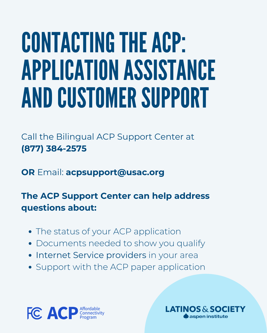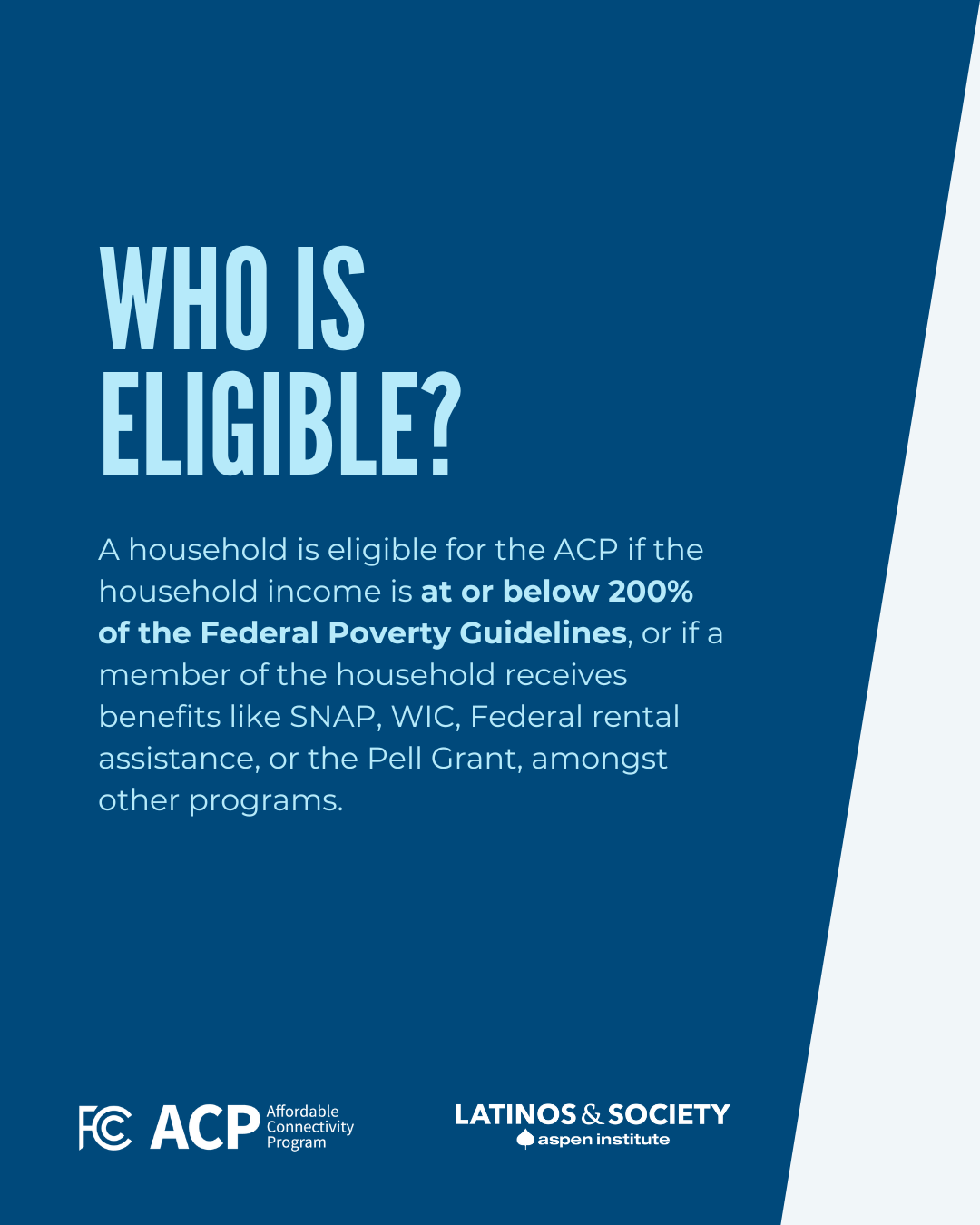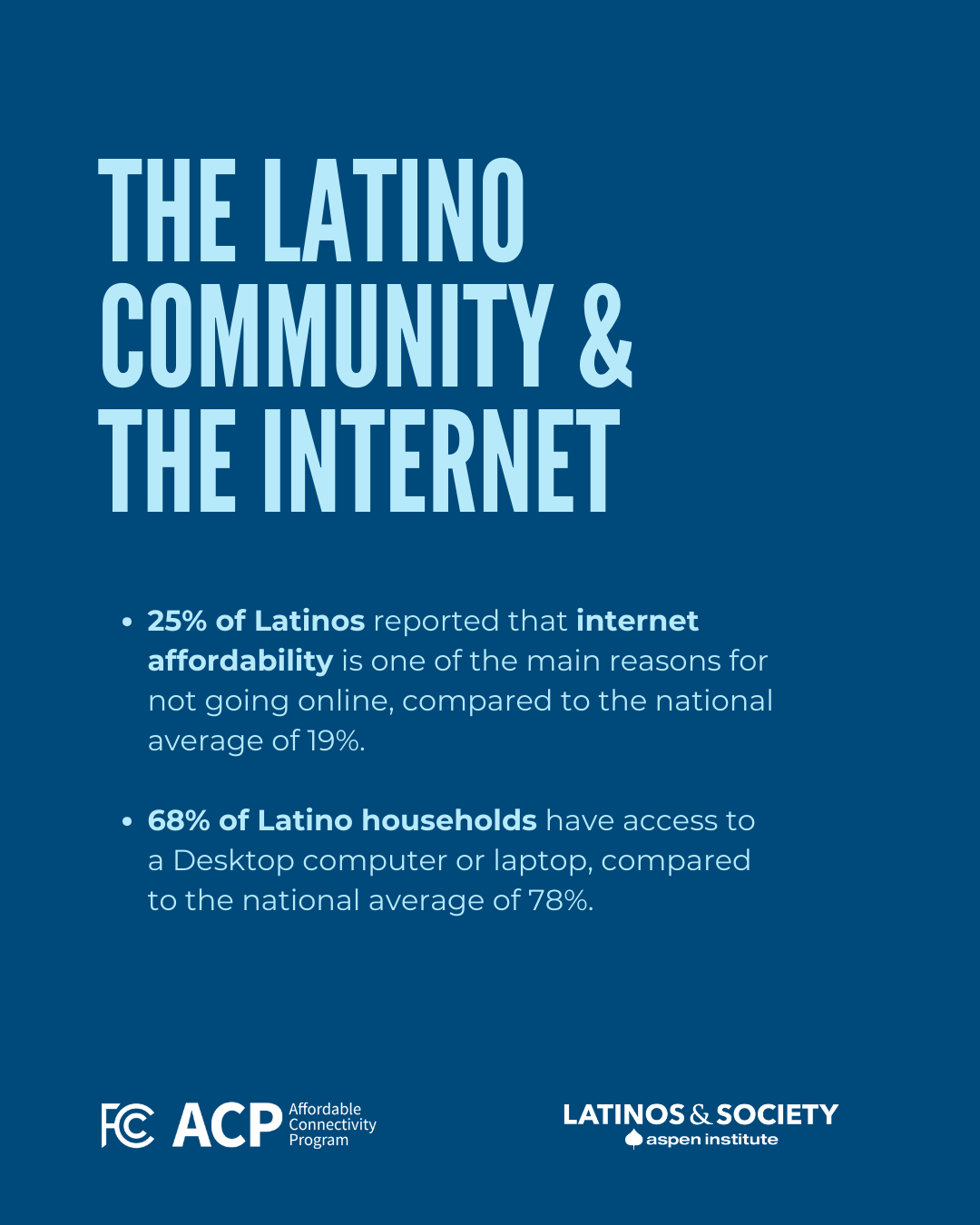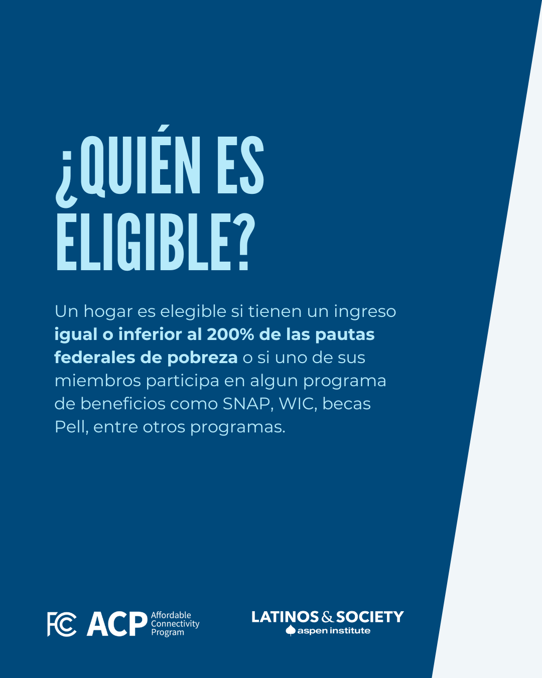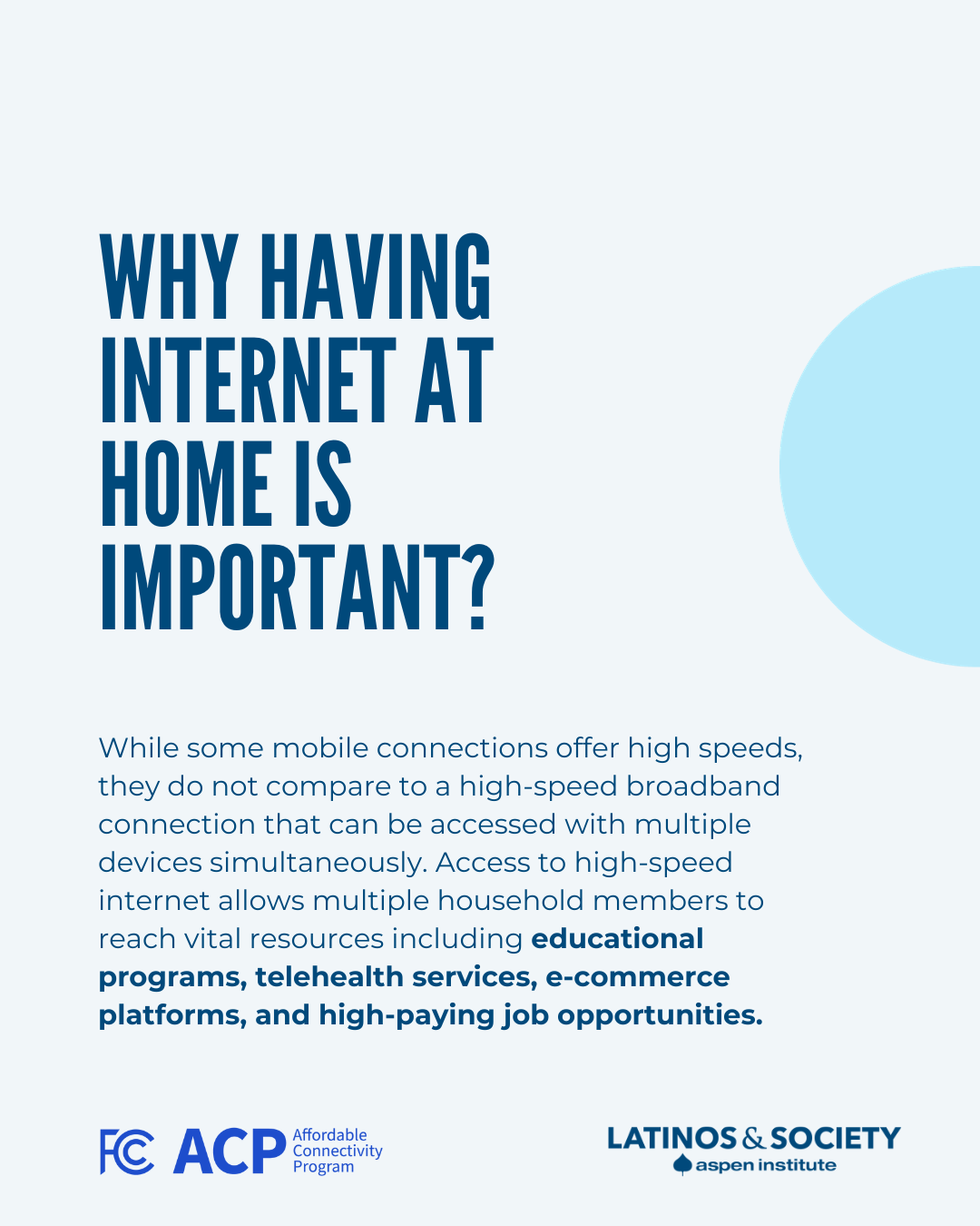 Aspen Latinos was awarded a grant to support the FCC’s Affordable Connectivity Program (ACP) outreach efforts over the next two years. This federally funded benefit provides a discount of up to $30 per month toward internet service for eligible households and up to $75 per month for households on qualifying Tribal lands. Eligible households can also receive a one-time discount of up to $100 to purchase a device.Aspen Latinos is developing and deploying a public awareness campaign in both English and Spanish through traditional media channels and social media. Aspen Latinos will also collaborate with trusted community organizations to spread the benefit and promote enrollment of eligible households. Below are preliminary ACP outreach collateral items that can be downloaded, shared, and distributed among your networks.