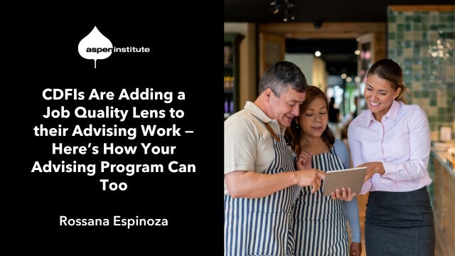 This webinar, which EOP hosted on June 26, 2025, features highlights from the guide, as well as insights from CDFI leaders about their approaches to building job quality advising into their work. It features opening remarks from the Aspen Institute’s Maureen Conway and Bryn Morgan, followed by a panel discussion with Amanda Blondeau (Northern Initiatives), Cynthia Murphy (Coastal Enterprises, Inc.), and Delphine Ntegeye (African Development Center).