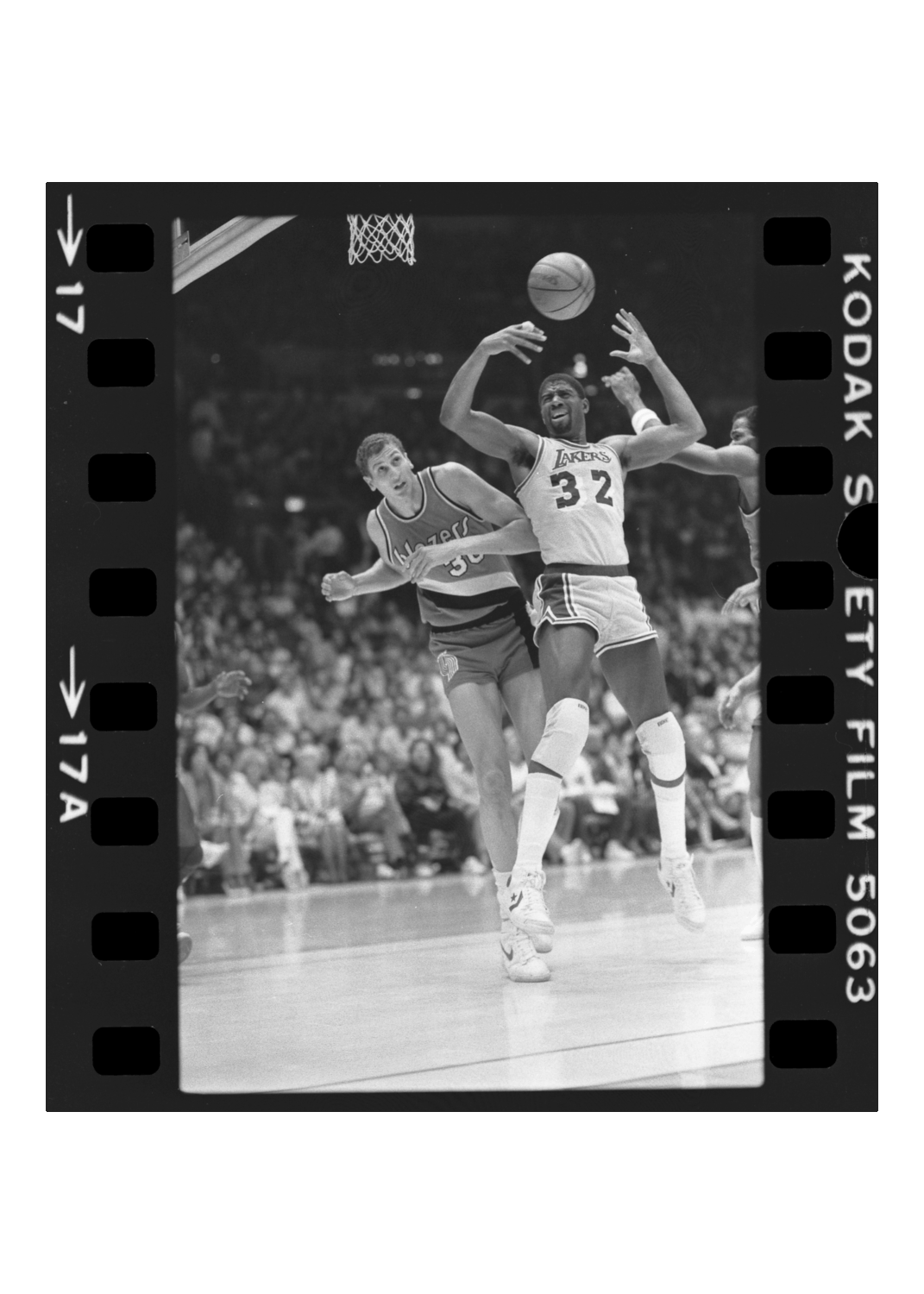 Image: Magic Johnson and Trail Blazer’s Sam Bowie playing in Lakers game in Los Angeles, Calif., 1985, photographed by Lori Shepler