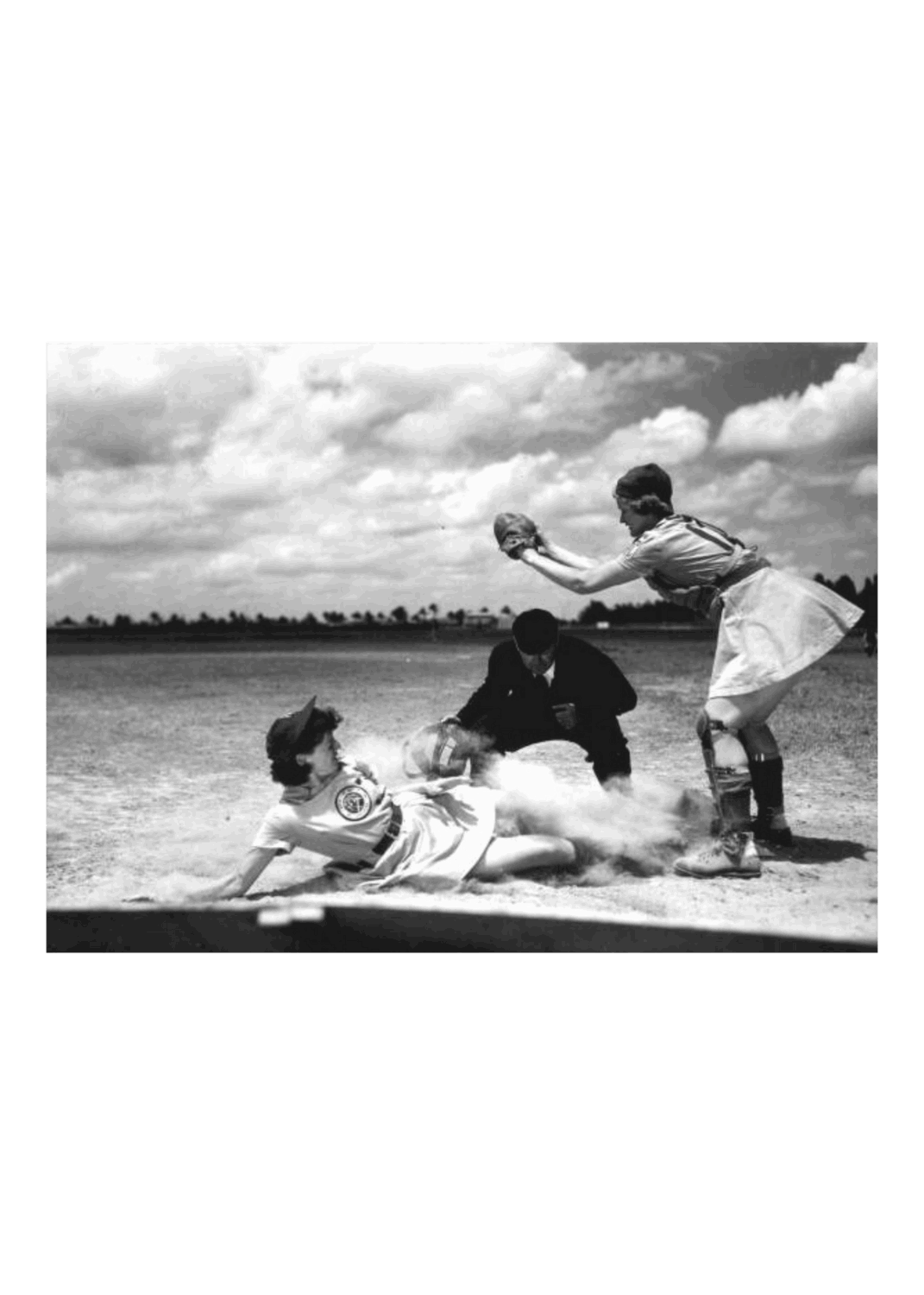 Image: All American Girls Professional Baseball League player Marg Callaghan sliding into home plate as umpire Norris Ward watches- Opalocka, Florida (photographer unknown)