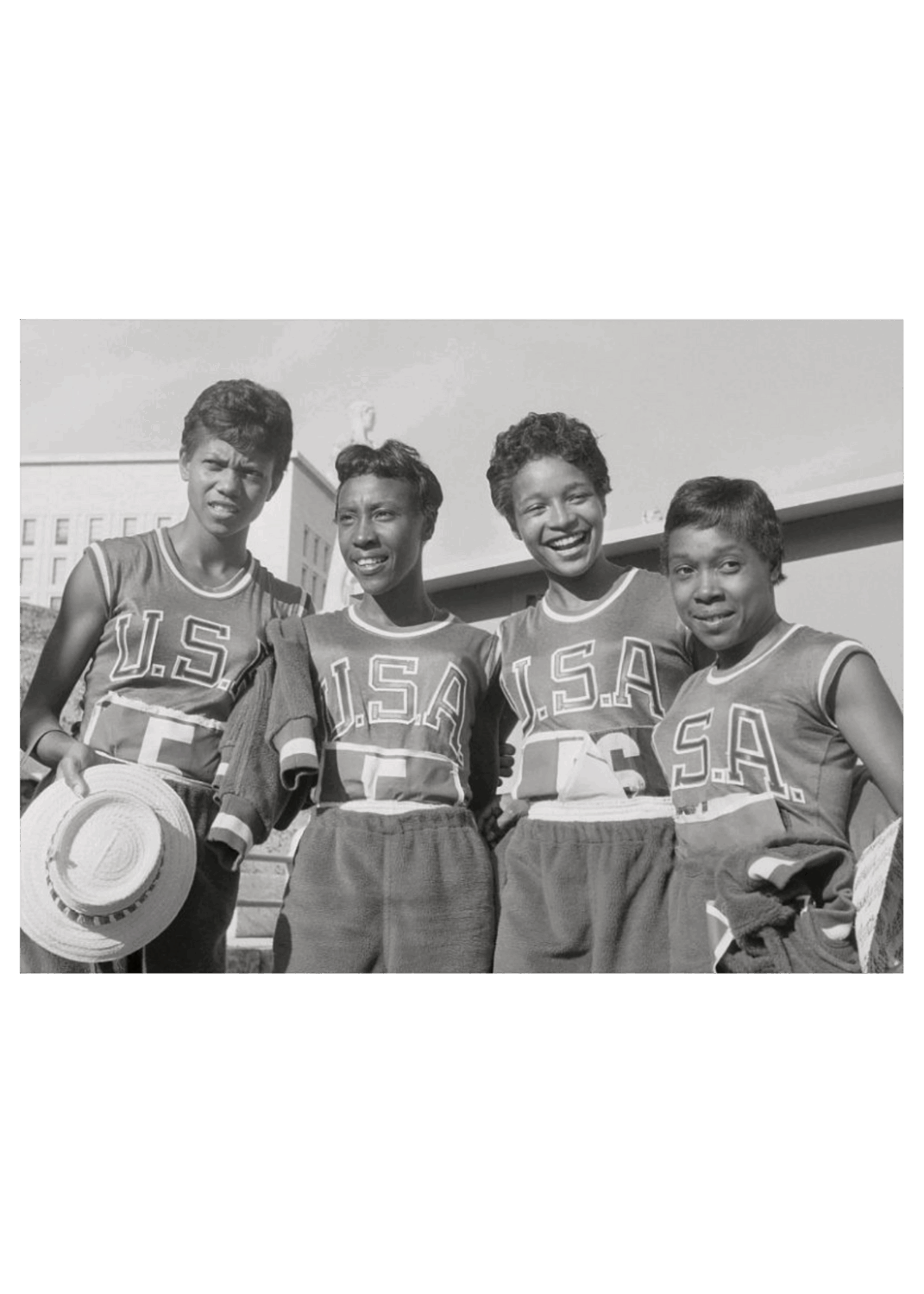 Image: American sprinters Wilma Rudolph, Lucinda Williams, Barbara Jones, and Martha Hudson at the Rome Olympics (1960) (photographer unknown)