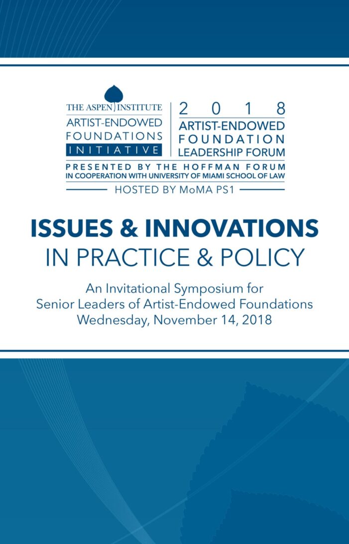 Review the Program Book of 2018’s invitational symposium for artist-endowed foundation leaders, examining issues and innovations in practice and policy influencing the field, presented by the Hoffman Forum in cooperation with University of Miami School of Law (UMSL) and AEFI, and hosted by MoMA PS1.