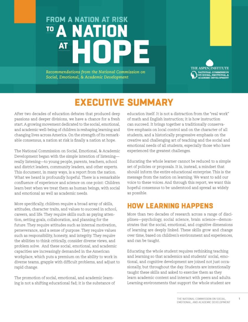 An executive summary of the National Commission on Social, Emotional, & Academic Development’s “From a Nation at Risk to a Nation at Hope,” a full report of research, practice, and policy recommendations for supporting the whole learner.
