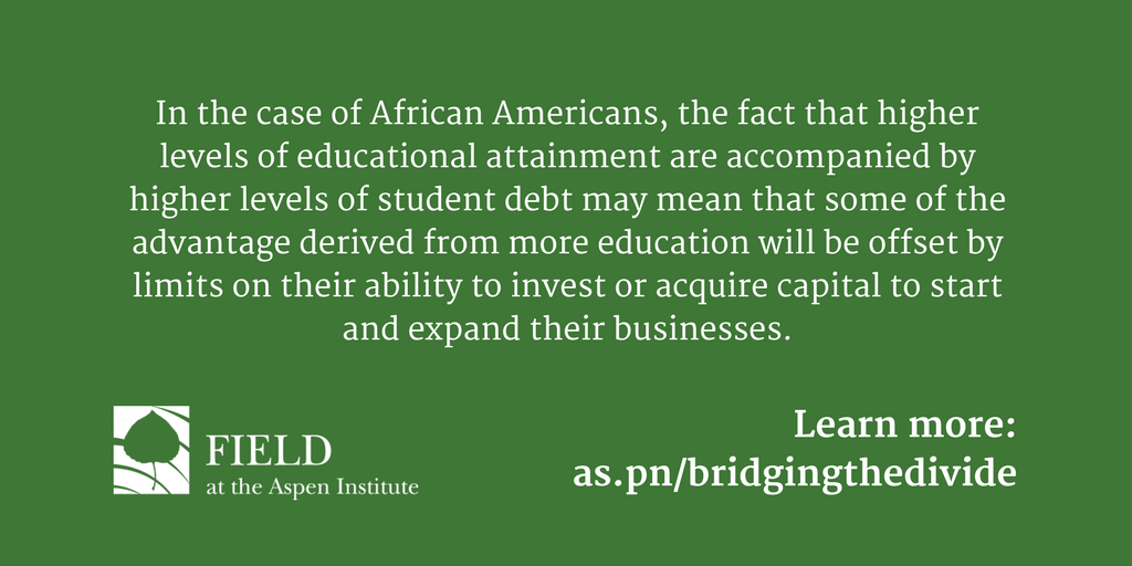 While there are positive signs, low levels of personal wealth and challenges in accessing business credit continue to be primary factors limiting the growth of firms owned by Latinos and African Americans. Relatively high and growing levels of student debt further complicate the financial challenges faced by entrepreneurs of color. Lower levels of education among Latinos constrain their ability to move into higher-growth, higher-revenue sectors, and also affect the skills they bring to businesses they create.