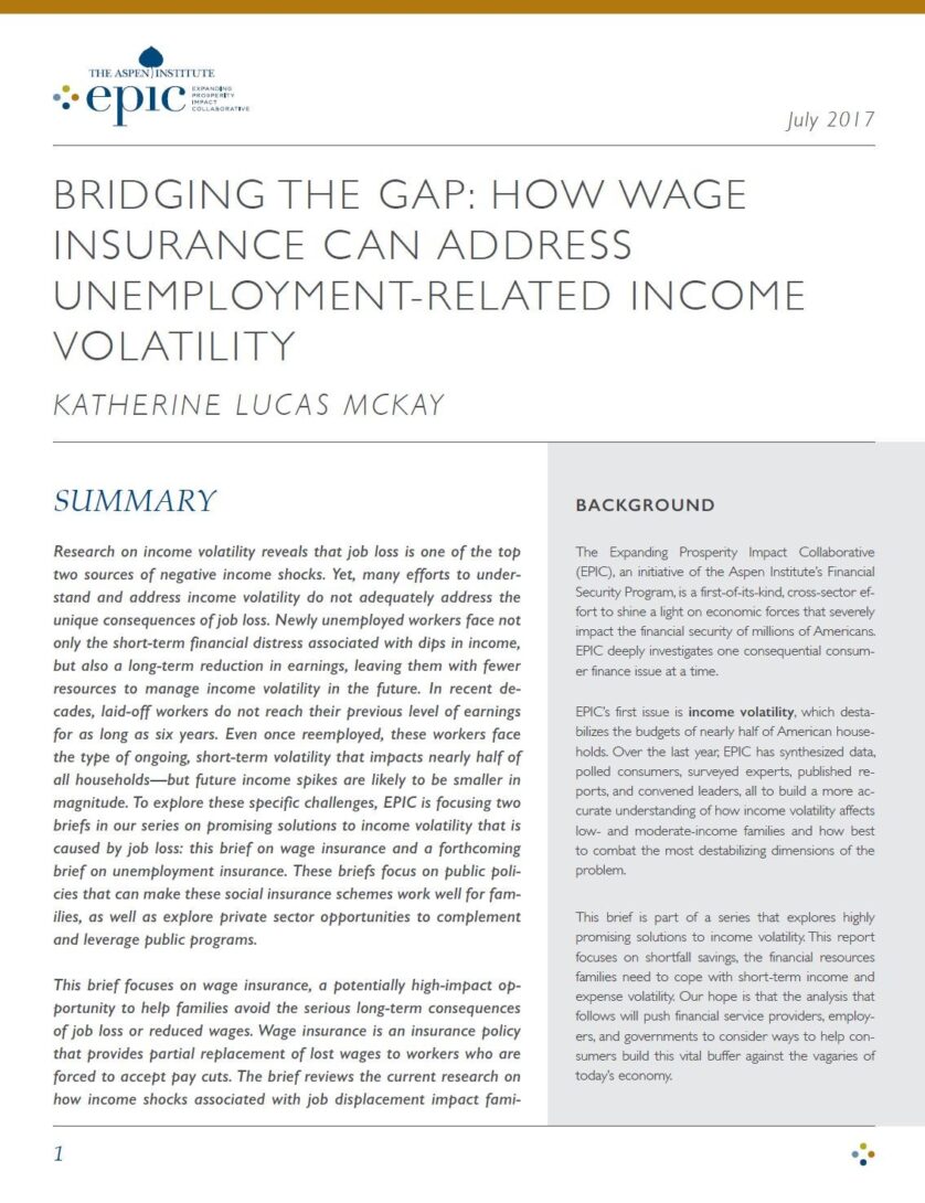 This brief focuses on wage insurance, a potentially high-impact opportunity to help families avoid the serious long-term consequences of job loss or reduced wages. Wage insurance is an insurance policy that provides partial replacement of lost wages to workers who are forced to accept pay cuts. The brief reviews the current research on how income shocks associated with job displacement impact families’ financial security in the short- and long-term. It reviews prior efforts to implement various forms of wage insurance, discusses the roles of key institutions – governments, employers, and financial services providers including insurers—and recommends principles for further action.