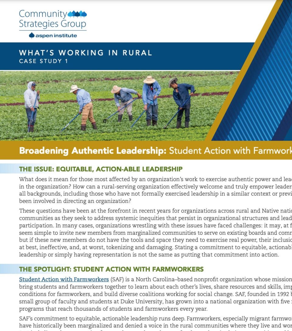 An innovator on this question is Student Action with Farmworkers (SAF), a North Carolina–based nonprofit organization whose mission is to bring students and farmworkers together to learn about each other’s lives, share resources and skills, improve conditions for farmworkers, and build diverse coalitions working for social change.