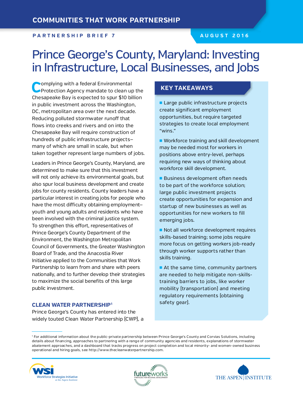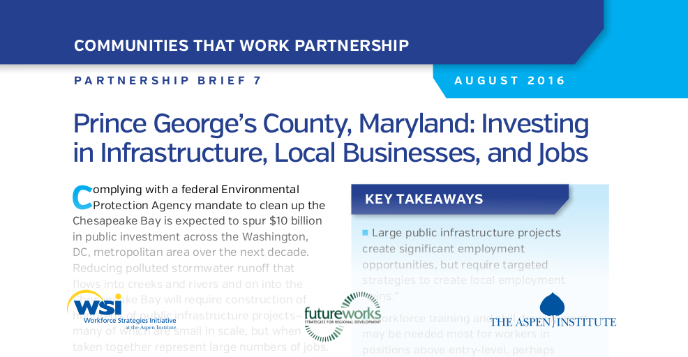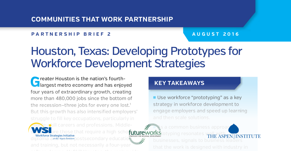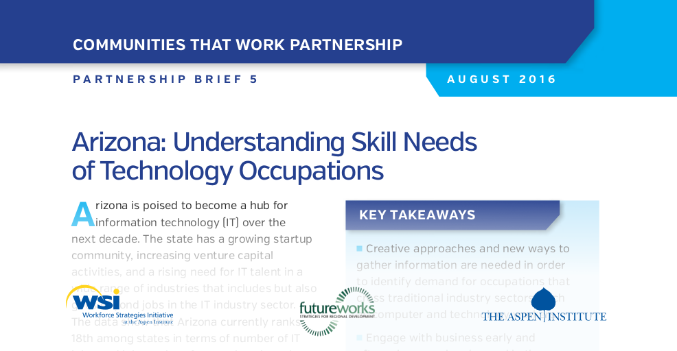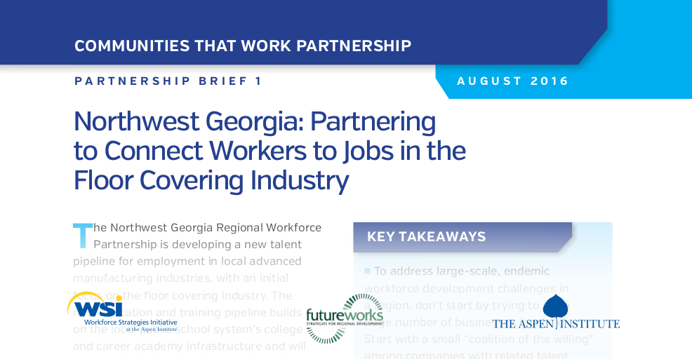In April 2015, the Aspen Institute Workforce Strategies Initiative jointly launched the Communities that Work Partnership with the US Economic Development Administration. The purpose of this initiative was to document and accelerate the development of employer-led regional workforce initiatives across the country. Seven competitively-selected sites — in Arizona, California, the District of Columbia, Georgia, New York (upstate and NYC), and Texas — participated in a learning exchange focused on bridging economic and workforce development to strengthen local talent pipelines and improve access to quality employment.