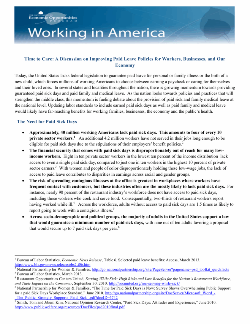 Today, the United States lacks federal legislation to guarantee paid leave for personal or family illness or the birth of a new child, which forces millions of working Americans to choose between earning a paycheck or caring for themselves and their loved ones. In several states and localities throughout the nation, there is growing momentum towards providing guaranteed paid sick days and paid family and medical leave. As the nation looks towards policies and practices that will strengthen the middle class, this momentum is fueling debate about the provision of paid sick and family medical leave at the national level. Updating labor standards to include earned paid sick days as well as paid family and medical leave would likely have far-reaching benefits for working families, businesses, the economy and the public’s health.