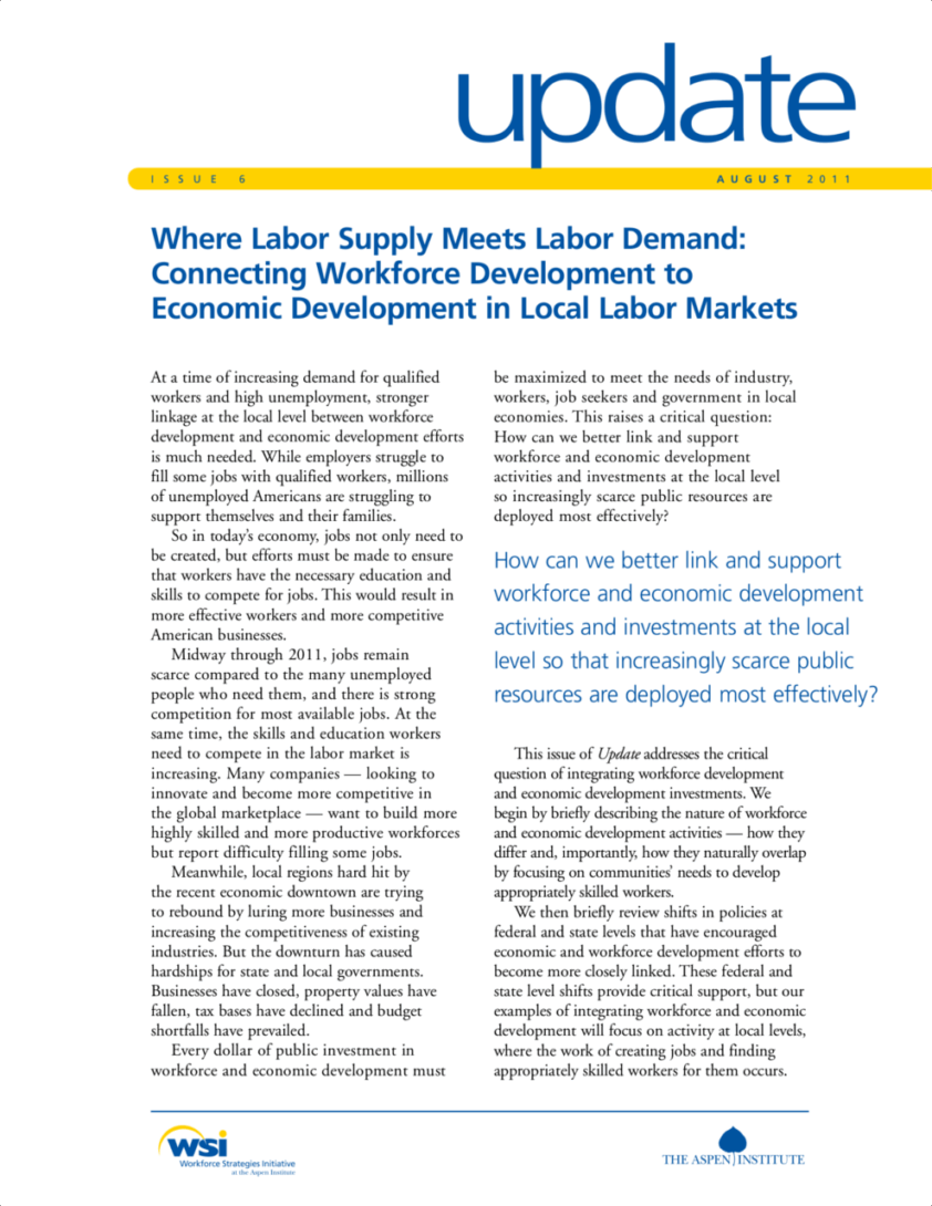 This edition of Update examines how workforce development and economic development efforts can be better aligned in local labor markets. The publication highlights how three workforce development programs worked with industry, government, and other stakeholders in their regions to ensure job opportunities created by economic development benefited their community. The report also discusses the capacities workforce development programs need to connect to industry and economic development activities, and offers guidance on how these capacities can be built and supported.