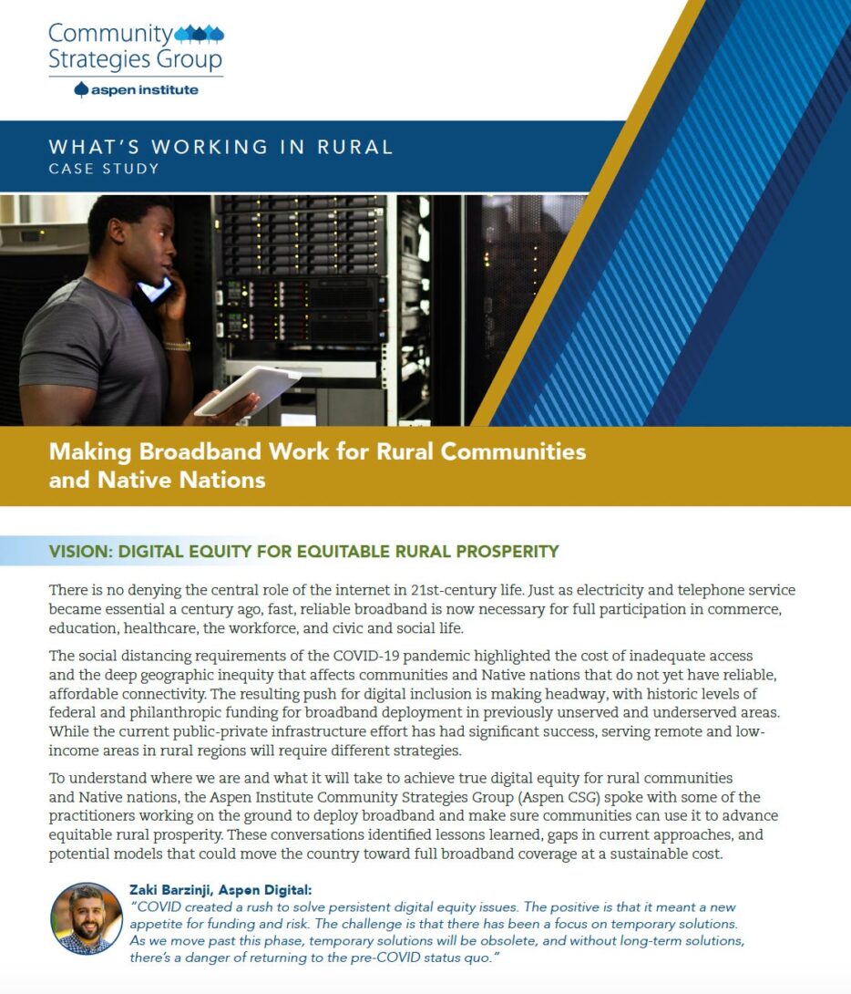 To understand where we are and what it will take to achieve true digital equity for rural communities and Native nations, the Aspen Institute Community Strategies Group (Aspen CSG) spoke with some of the practitioners working on the ground to deploy broadband and make sure communities can use it to advance equitable rural prosperity. These conversations identified lessons learned, gaps in current approaches, and potential models that could move the country toward full broadband coverage at a sustainable cost.