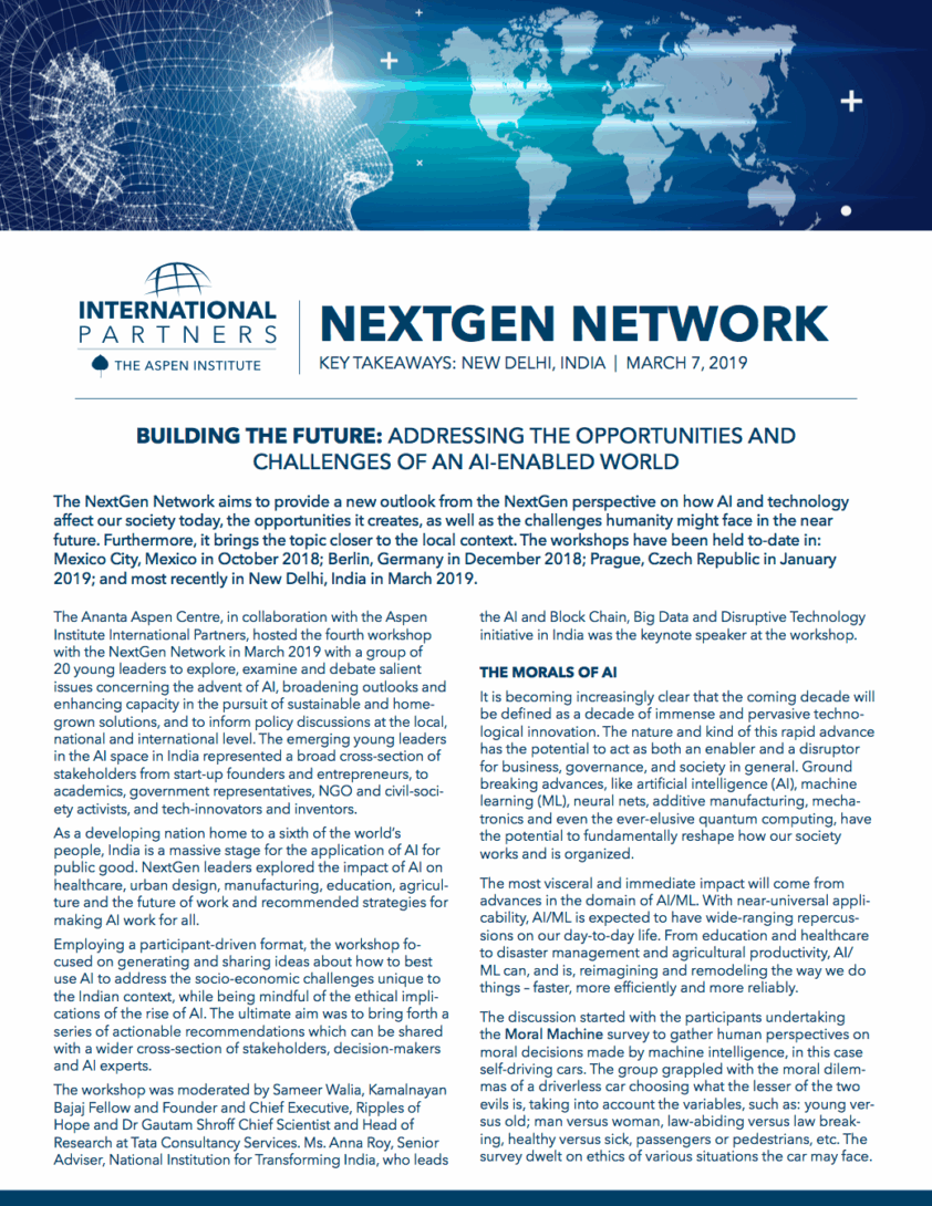 The Ananta Aspen Centre, in collaboration with the Aspen Institute International Partners, hosted the fourth workshop with the NextGen Network in March 2019 with a group of 20 young leaders to explore, examine and debate salient issues concerning the advent of AI, broadening outlooks and enhancing capacity in the pursuit of sustainable and homegrown solutions, and to inform policy discussions at the local, national and international level.