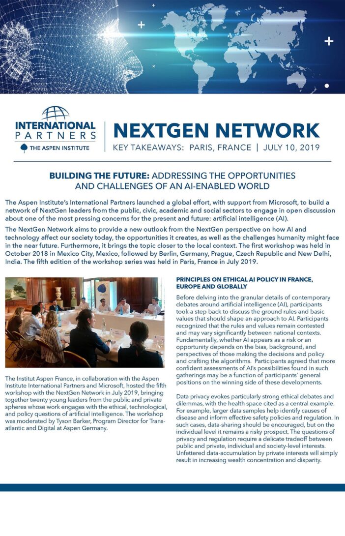 Aspen France, in collaboration with the Aspen Institute International Partners, hosted the fifth workshop with the NextGen Network in July 2019 with a group of 20 young leaders from the public and private spheres, whose work engages with the ethical, technological, and policy questions of artificial intelligence. The workshop was moderated by Tyson Barker, Program Director for Transatlantic and Digital at Aspen Germany.