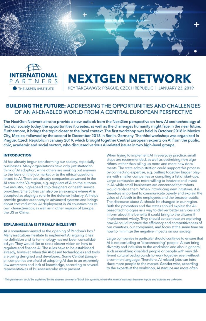 hosted the Network in Prague in January 2019, with participants from Hungary, Poland, Slovakia, and the Czech Republic. Participants emphasized that there should be a focus on mapping where exactly AI can support existing professions, create new ones, but most importantly streamline the education system towards current trends and lifelong learning. It is essential to speed up the adoption of AI in Europe, as well as connect it with major challenges in society, such as tackling climate change or innovating healthcare, where, for example, AI can be explained by its promoters as a way of delivering better services rather than merely introducing a new technology.