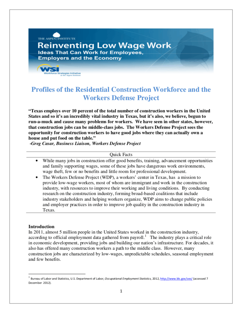 Profiles of the Residential Construction Workforce and the Workers Defense Project