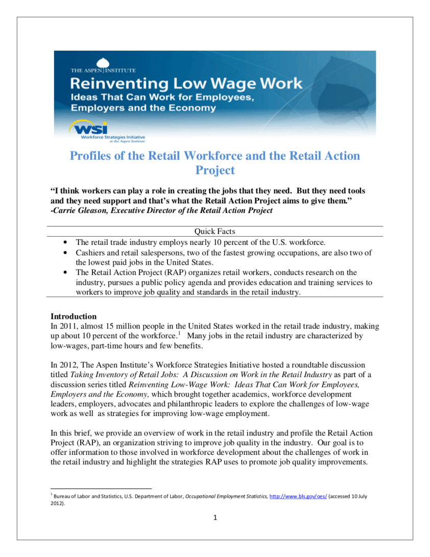This report illustrates the state of low-wage work in the retail industry and provides a profile of the Retail Action Project, an organization striving to improve job quality in retail.
