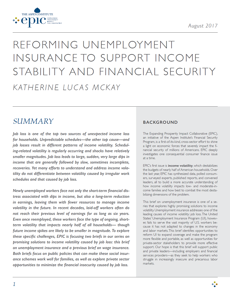 Newly unemployed workers face not only the short-term financial distress associated with dips in income, but also a long-term reduction in earnings, leaving them with fewer resources to manage income volatility in the future. In recent decades, laid-off workers often do not reach their previous level of earnings for as long as six years. Even once reemployed, these workers face the type of ongoing, short term volatility that impacts nearly half of all households— though future income spikes are likely to be smaller in magnitude. To explore these specific challenges, EPIC is focusing two briefs in our series on promising solutions to income volatility caused by job loss: this brief on unemployment insurance and a previous brief on wage insurance. Both briefs focus on public policies that can make these social insurance schemes work well for families, as well as explore private sector opportunities to minimize the financial insecurity caused by job loss.