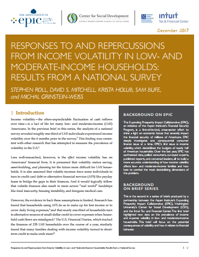 This is the second in a series of briefs produced by a partnership between the Aspen Institute’s Expanding Prosperity Impact Collaborative (EPIC), Washington University’s Center for Social Development (CSD), and the Intuit Tax and Financial Center. The first brief highlighted new data on the prevalence of income and expense volatility in low- and moderate-income households. This brief will focus on the potential consequences of volatility and how it relates to financial behavior.