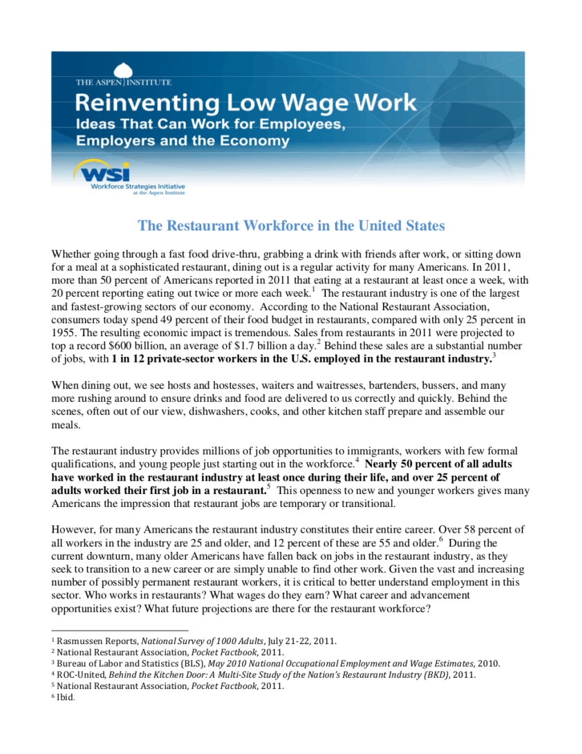 This resource provides an overview of the restaurant workforce in the United States including information about the demographics of workers in the industry, the size of the workforce, wages and benefits, and working conditions.  The resource was developed as part of  an event AspenWSI held on March 7th, 2012 titled “From Fast Food to Fine Dining:  A Discussion on Work in the Restaurant Industry,” which is part of AspenWSI’s series, “Reinventing Low-Wage Work: Ideas That Can Work for Employees, Employers and the Economy.”