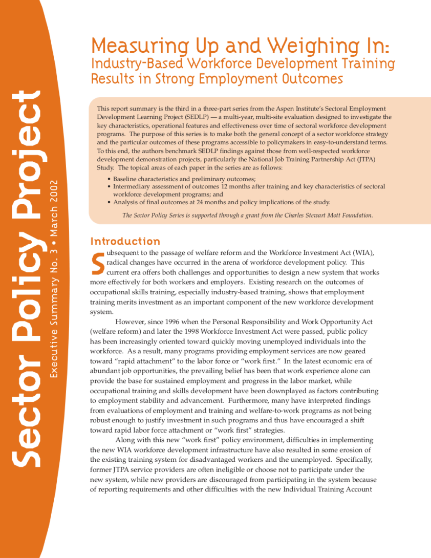 This executive summary is the third in a three-part series, the purpose of which is to make both the general concept of sector strategy and the particular outcomes of sector programs accessible to policymakers in easy-to-understand terms. To this end, the authors benchmark SEDLP findings against those from well-respected workforce development demonstration projects, particularly the National Job Training and Partnership Act (JTPA) Study. The executive summary provides an analysis of the final outcomes at 24 months, and presents policy implications of the study.