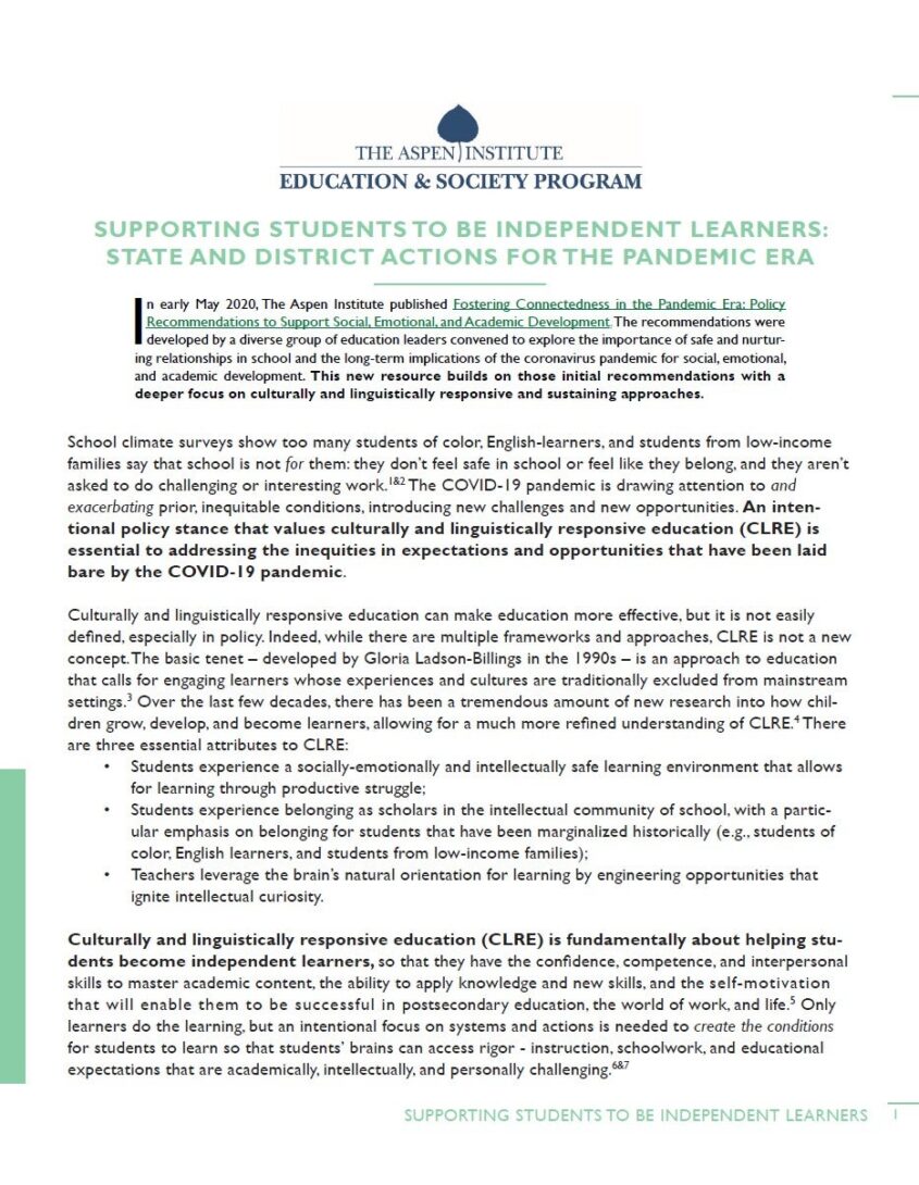 In May 2020, the Aspen Institute Education & Society Program shared ten recommended state actions for Fostering Connectedness in the Pandemic Era that were developed with a diverse group of education leaders. The pandemic and resulting closure of school buildings have revealed the deep inequities that already existed in many schools, and connectedness is one of those gaps. Data from school climate surveys demonstrates that students of color, English-learners, and students from low-income families do not feel safe at school, in part because they do not have the kind of caring, trusted relationships that create belonging – and in part because they do not feel challenged with meaningful, rigorous work.