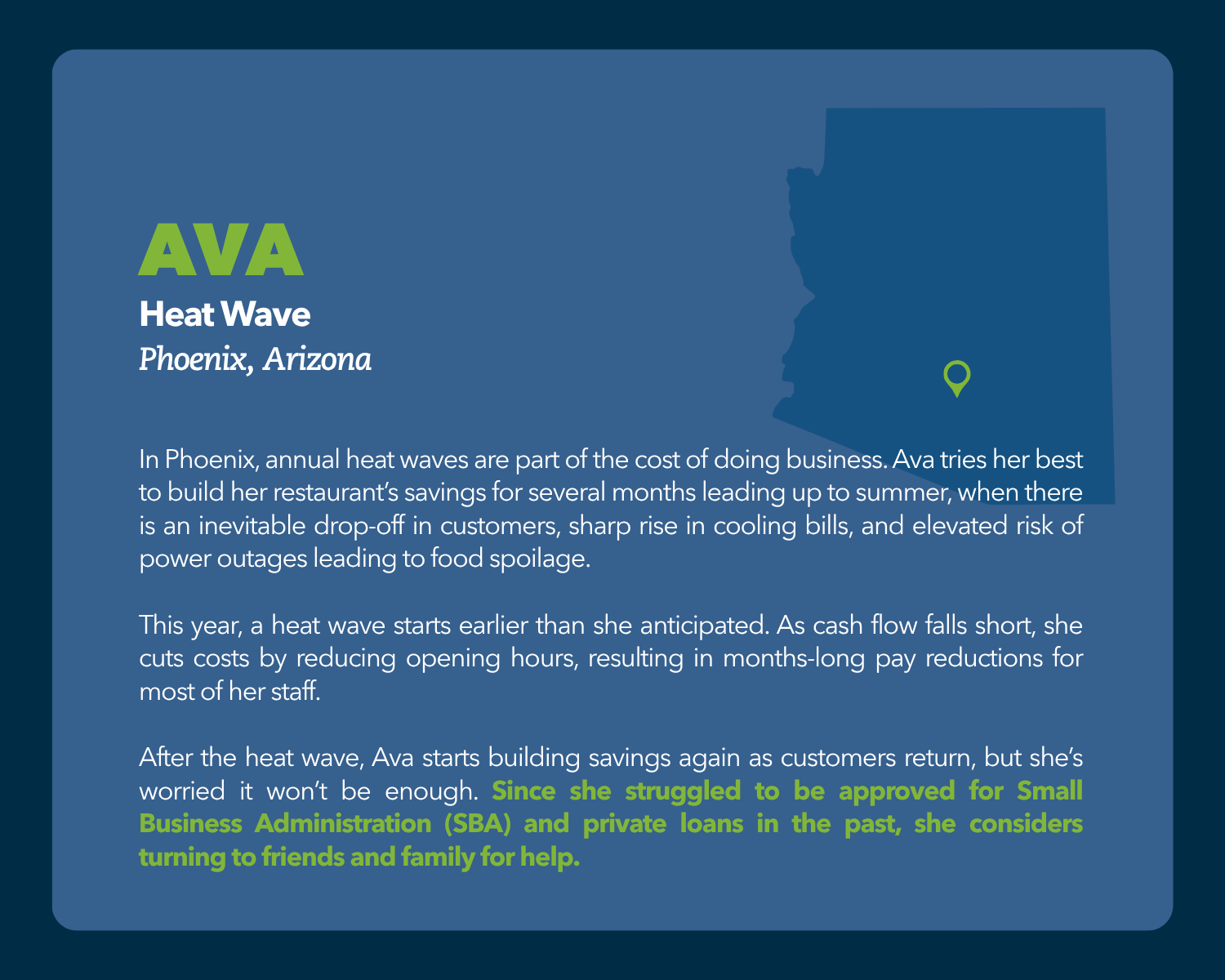 In Phoenix, annual heat waves are part of the cost of doing business. Ava tries her best to build her restaurant’s savings for several months leading up to summer, when there is an inevitable drop-off in customers, sharp rise in cooling bills, and elevated risk of power outages leading to food spoilage.