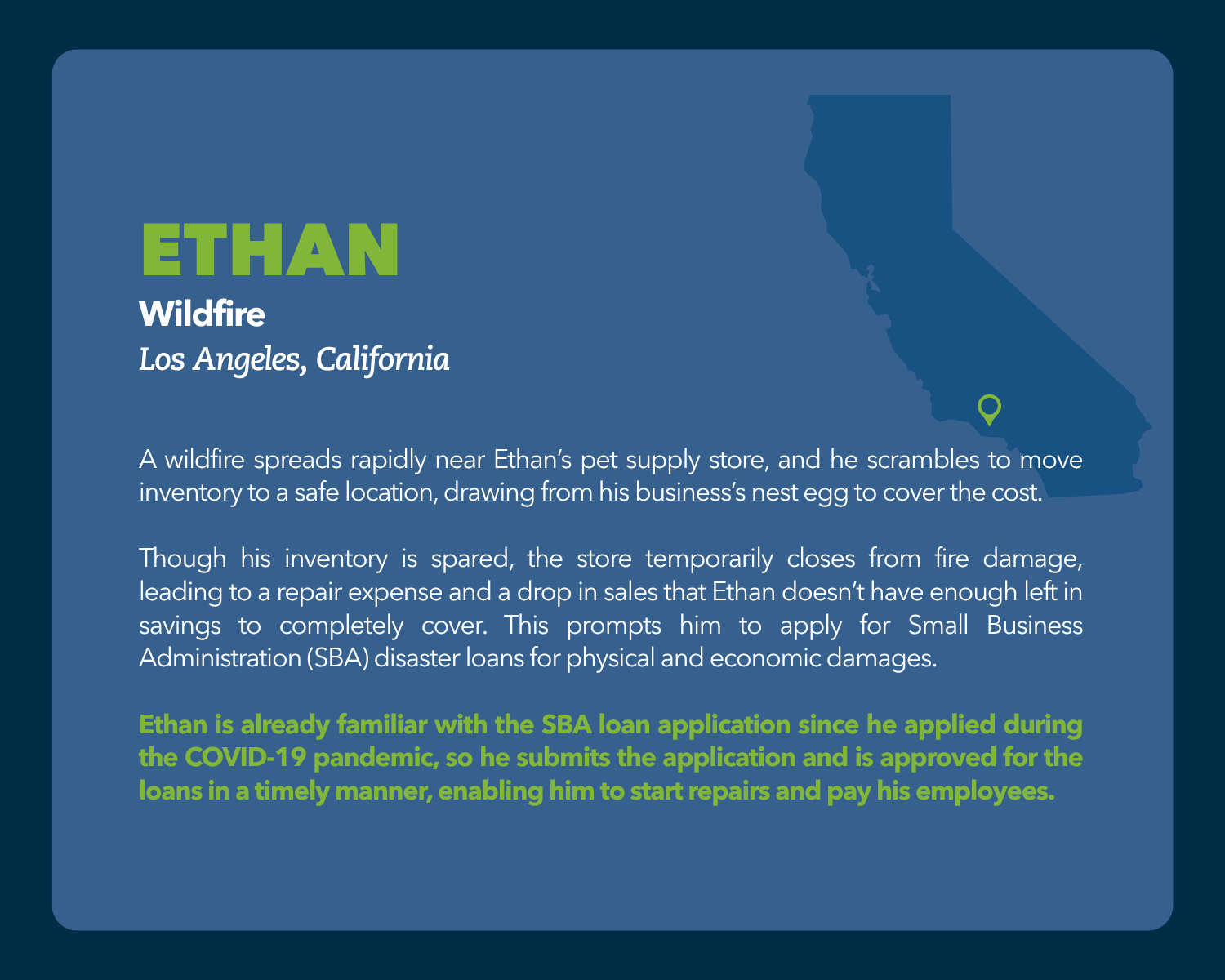 Though his inventory is spared, the store temporarily closes from fire damage, leading to a repair expense and a drop in sales that Ethan doesn’t have enough left in savings to completely cover. This prompts him to apply for Small Business Administration (SBA) disaster loans for physical and economic damages.