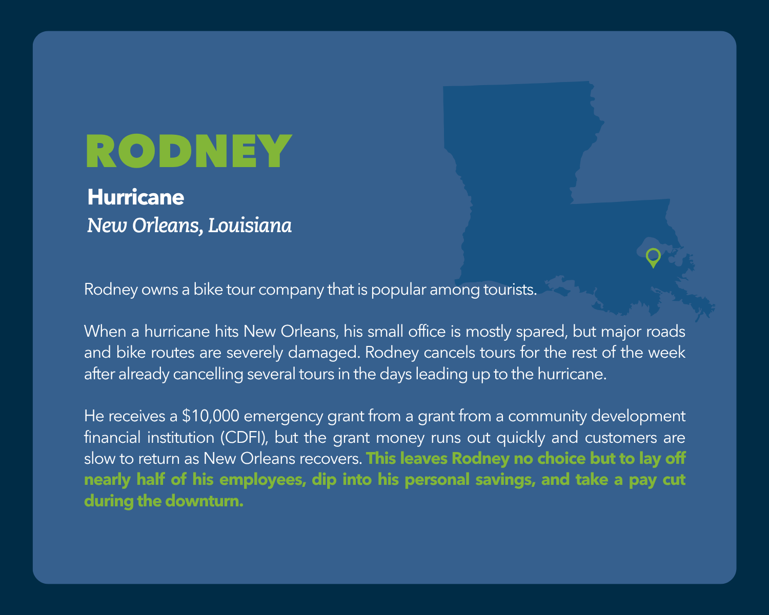 He receives a $10,000 emergency grant from a community development financial institution (CDFI), but the grant money runs out quickly and customers are slow to return as New Orleans recovers. This leaves Rodney no choice but to lay off nearly half of his employees, dip into his personal savings, and take a pay cut during the downturn.